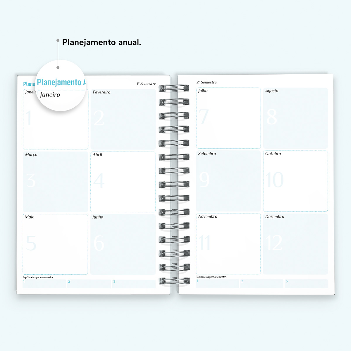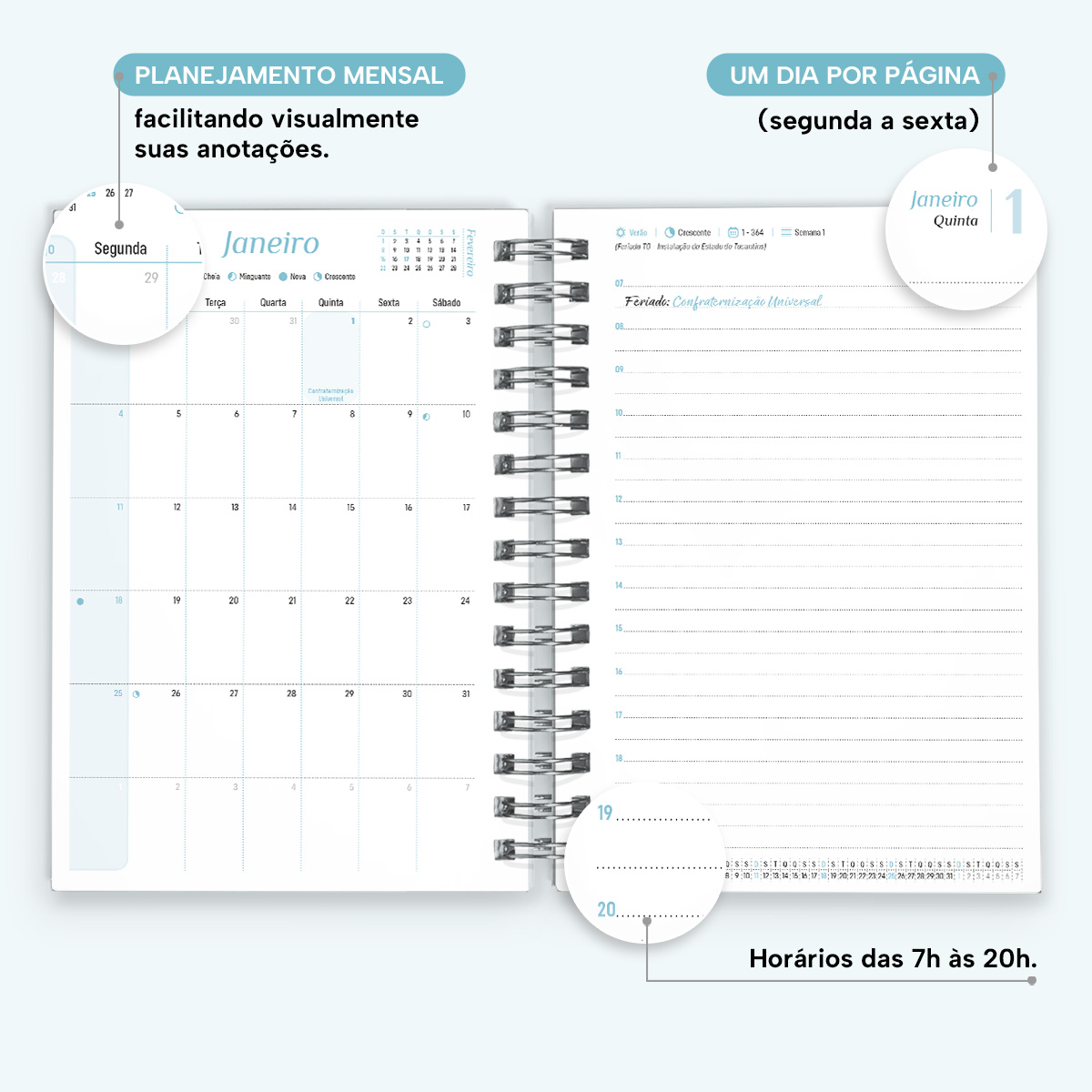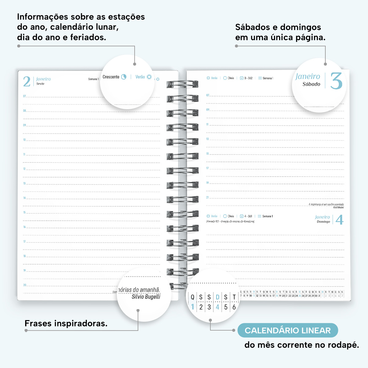 A cada mês, você pode contar com uma página de planejamento mensal, facilitando a visualização de suas principais anotações. Além disso, cada página possui indicações de feriados, estações do ano, calendário lunar, número da semana, frases inspiradoras e um calendário linear do mês no rodapé.