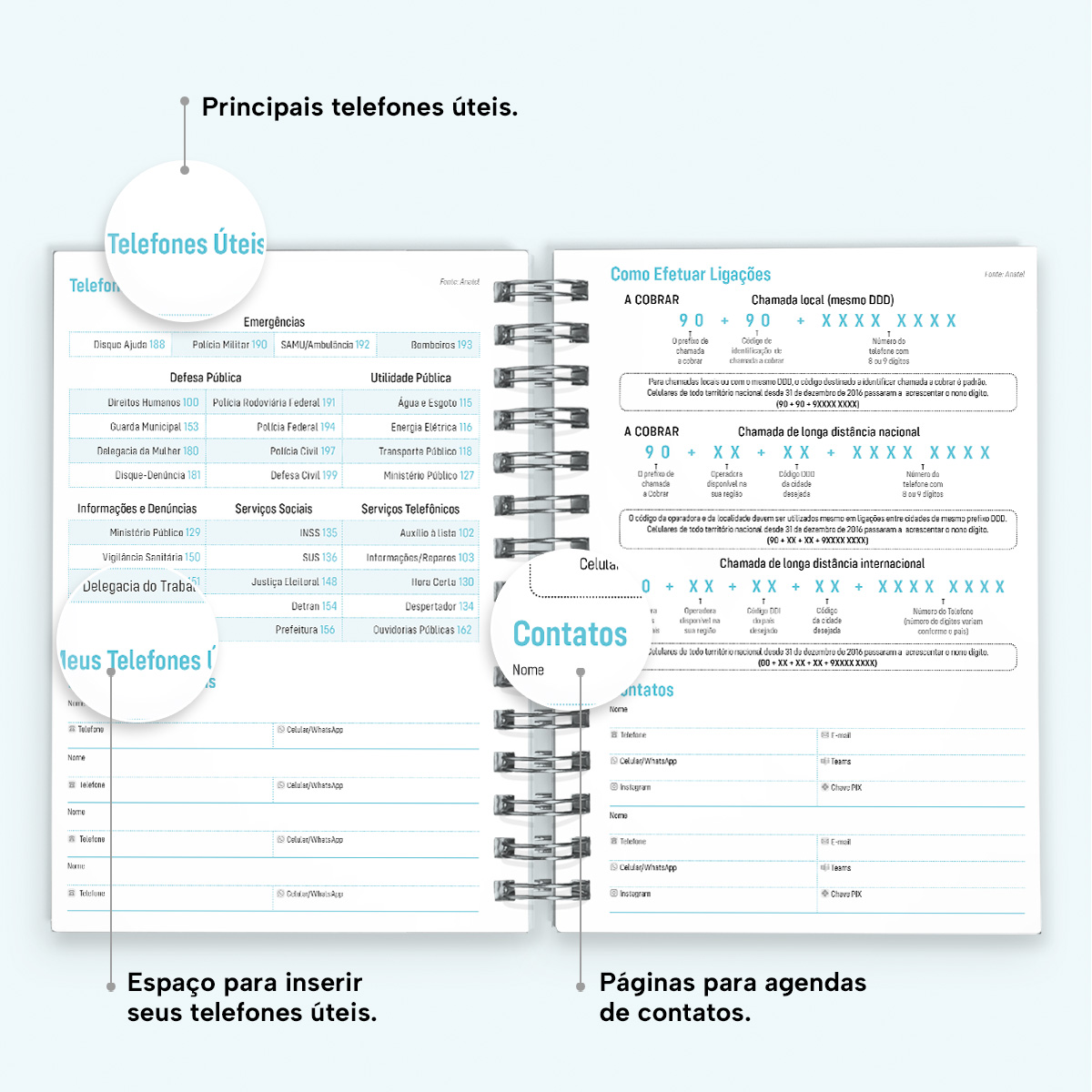Ao final da agenda, há uma página com os principais números de telefone úteis, além de instruções sobre como efetuar ligações, uma seção dedicada a contatos, uma página em formato “bullet list” para itens de lista, páginas para anotações livres e um mapa do Brasil.