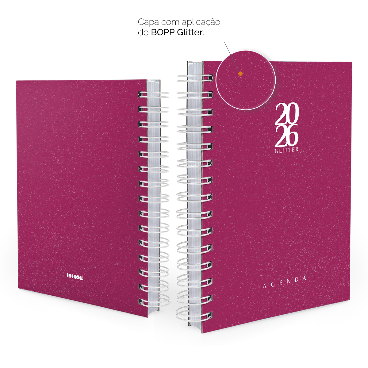 Nossa agenda possui um acabamento especial com BOPP glitter que proporciona o efeito de brilho glitter que se destaca sob luz intensa, e o melhor de tudo é que o glitter não solta!