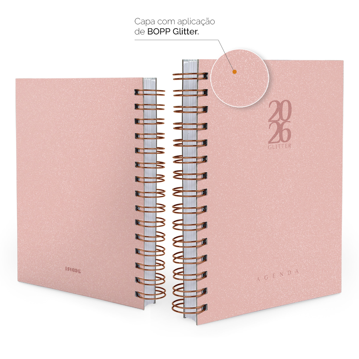 Nossa agenda possui um acabamento especial com BOPP glitter que proporciona o efeito de brilho glitter que se destaca sob luz intensa, e o melhor de tudo é que o glitter não solta!