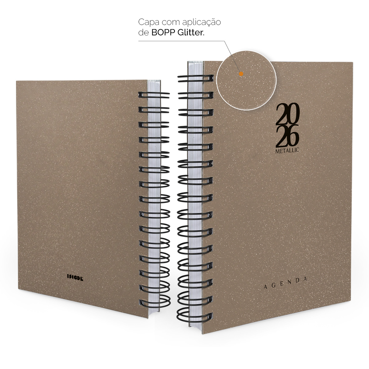 Nossa agenda possui um acabamento especial com BOPP glitter que proporciona o efeito de brilho glitter que se destaca sob luz intensa, e o melhor de tudo é que o glitter não solta!