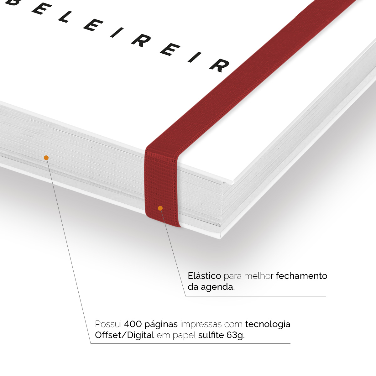 Logo no início, você pode preencher todos os seus dados pessoais, comerciais e emergenciais. Na sequência, temos uma lista de telefones úteis, instruções sobre como efetuar ligações, uma agenda de contatos, visão do calendário completo de 2026 e um planejamento anual para anotar os objetivos e metas de cada semestre.
