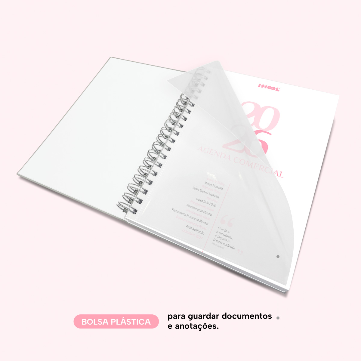 Logo no início, você pode preencher todos os seus dados pessoais, comerciais e emergenciais. Na sequência, temos uma lista de telefones úteis, instruções sobre como efetuar ligações, uma agenda de contatos, visão do calendário completo de 2026 e um planejamento anual para anotar os objetivos e metas de cada semestre.