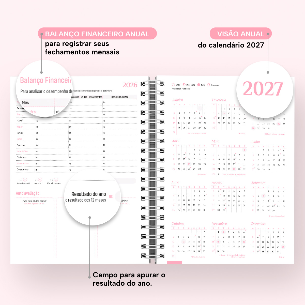 No final da agenda, ainda temos o balanço financeiro anual para você registrar o fechamento de cada mês e apurar o resultado do ano.