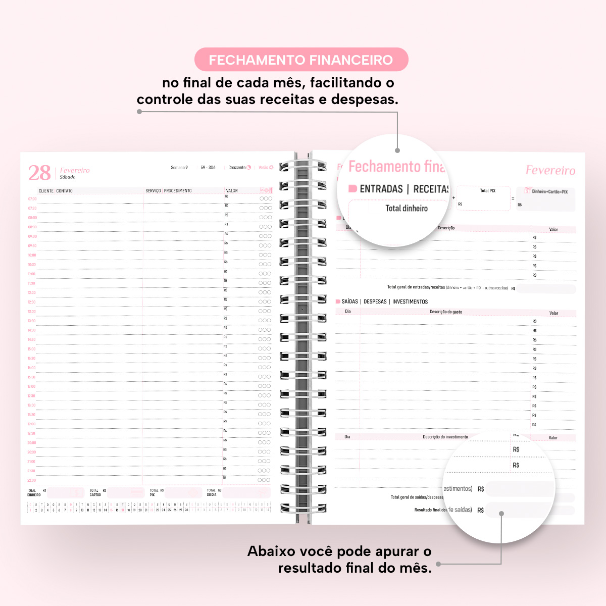 No início de cada mês, há um planejamento mensal, facilitando visualmente as suas principais anotações, e ao final, um fechamento financeiro para descrever todas as entradas e despesas e/ou investimentos, possibilitando mensurar e controlar o resultado total dos meses.