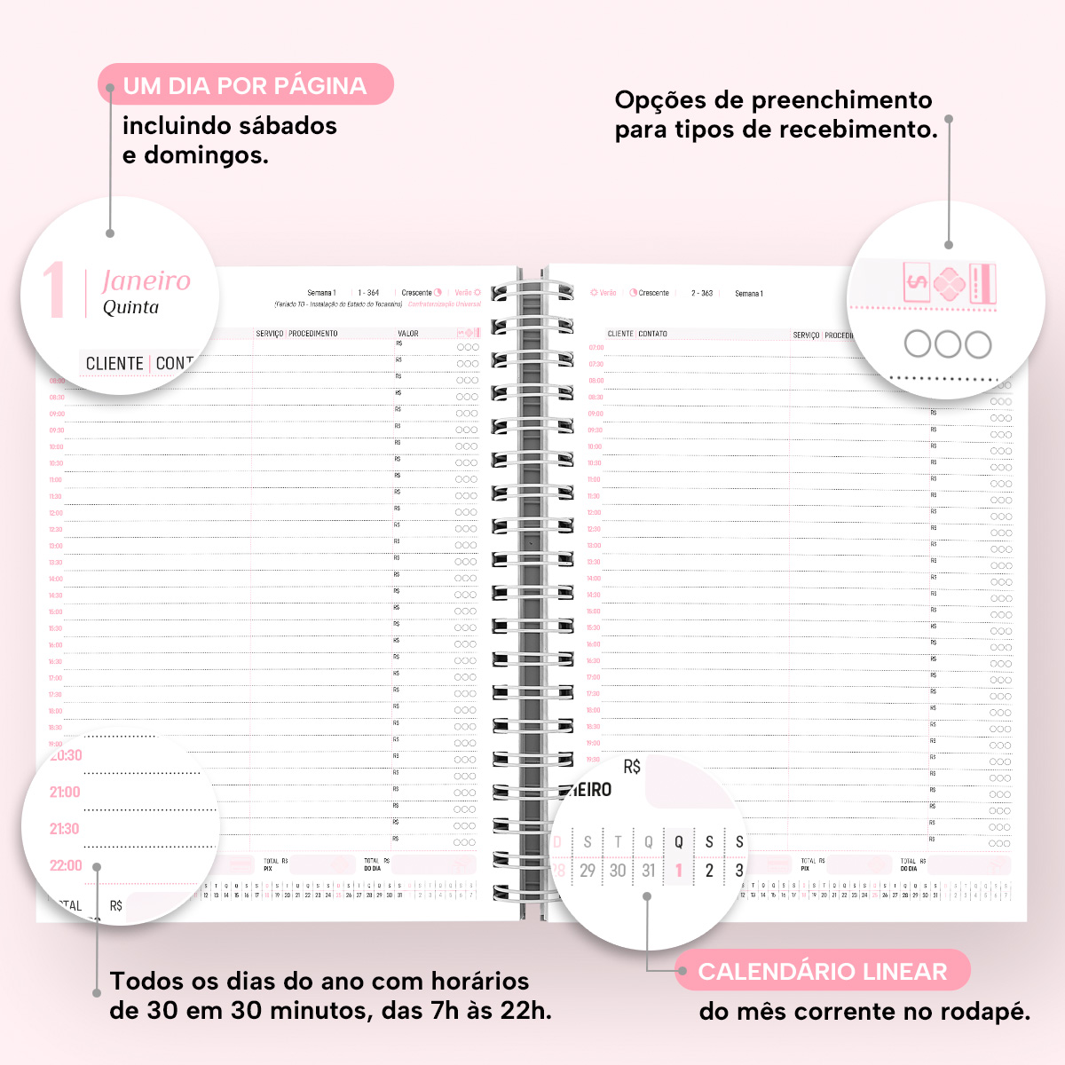 A agenda comercial possui marcação dos horários divididos de 30 em 30 minutos, abrangendo o dia todo de trabalho, das 7h às 22h. Seu grande diferencial são as pautas, com colunas para você marcar o nome do cliente, o contato, o serviço/procedimento realizado, o valor e até mesmo a forma de pagamento! Ao final de cada página, você pode inserir também o valor total das receitas (faturamento) do dia.