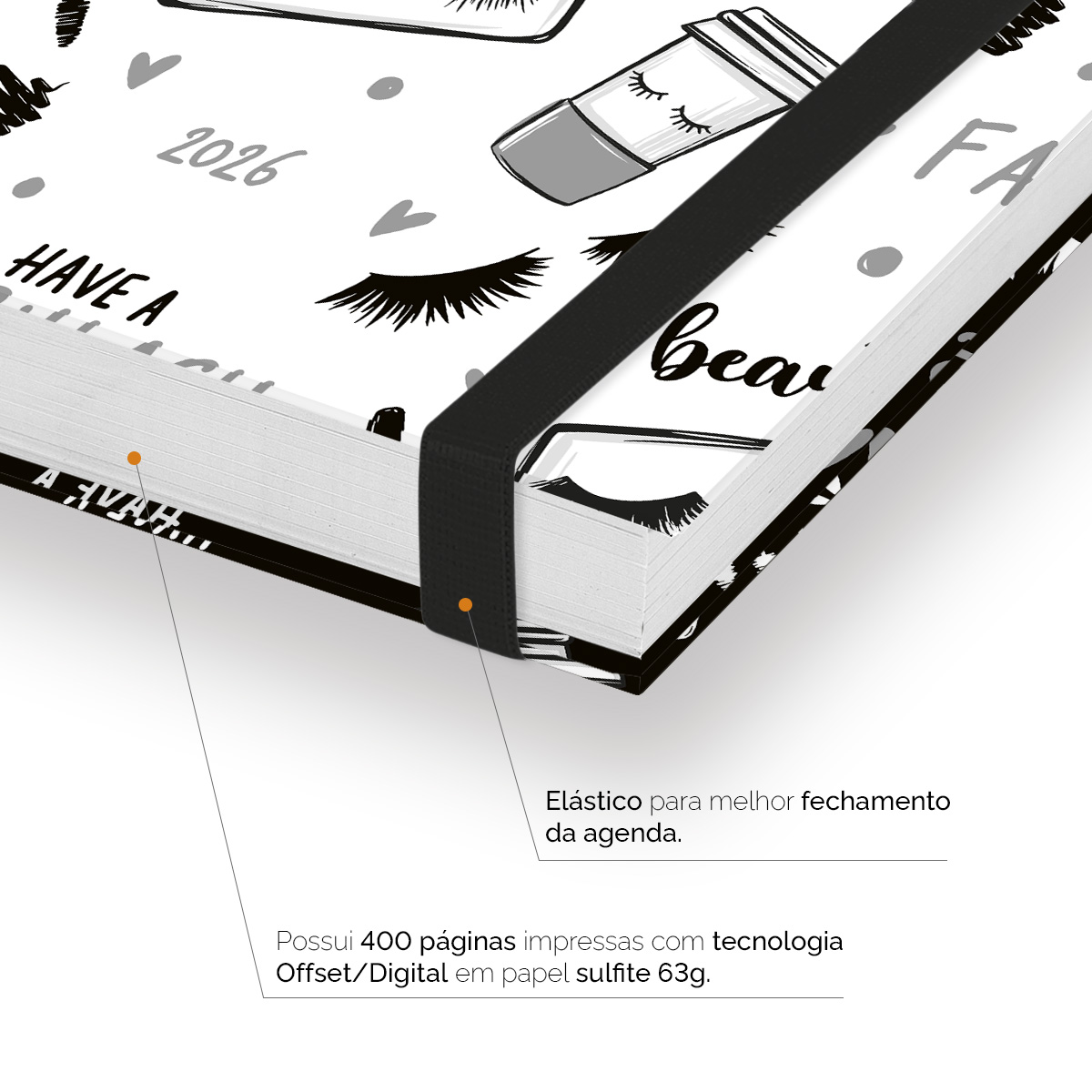 Logo no início, você pode preencher todos os seus dados pessoais, comerciais e emergenciais. Na sequência, temos uma lista de telefones úteis, instruções sobre como efetuar ligações, uma agenda de contatos, visão do calendário completo de 2026 e um planejamento anual para anotar os objetivos e metas de cada semestre.
