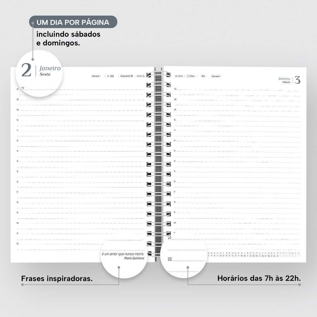 Em cada mês você pode contar com uma página de planejamento mensal, facilitando visualmente as suas principais anotações. Além disso, cada página possui indicação de feriados, das estações do ano, calendário lunar, indicador do número da semana, frases inspiradoras e um calendário linear do mês no rodapé.