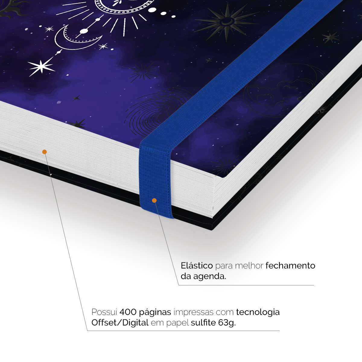 Em cada mês você pode contar com uma página de planejamento mensal, facilitando visualmente as suas principais anotações. Além disso, cada página possui indicação de feriados, das estações do ano, calendário lunar, indicador do número da semana, frases inspiradoras e um calendário linear do mês no rodapé.