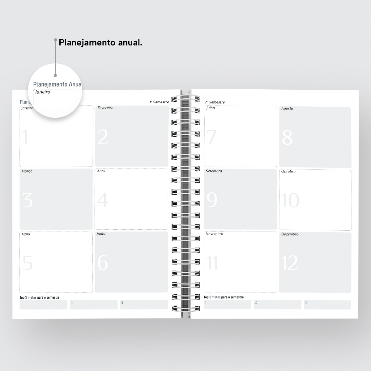 Na sequência temos a visão do calendário completo de 2026 seguido de um planejamento anual para anotar os objetivos e metas de cada semestre.
