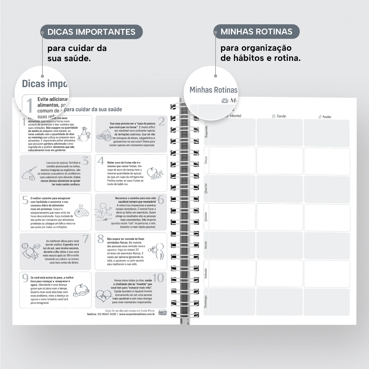 Logo no início, você poderá inserir todos os dados pessoais, comerciais e emergenciais, seguido pela “Minha Página ON”, ideal para registrar suas contas digitais, com seus respectivos logins e senhas, e uma página de “Datas Importantes/Aniversários”, com os 12 meses do ano organizados para você anotar aniversários e datas a serem lembradas e também uma página para organização de rotina.