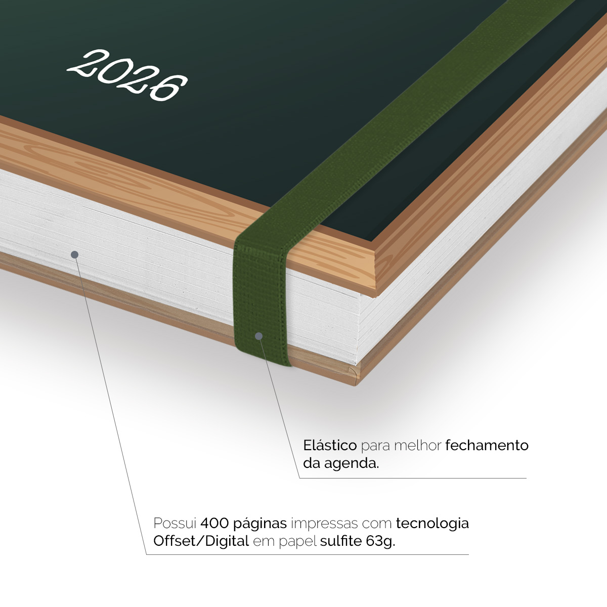 Todas as datas (dias da semana e finais de semana) ocupam páginas inteiras, inclusive sábados, domingos e feriados. Com o tamanho de 18x24,5 cm, ela é 30% maior que os modelos tradicionais.