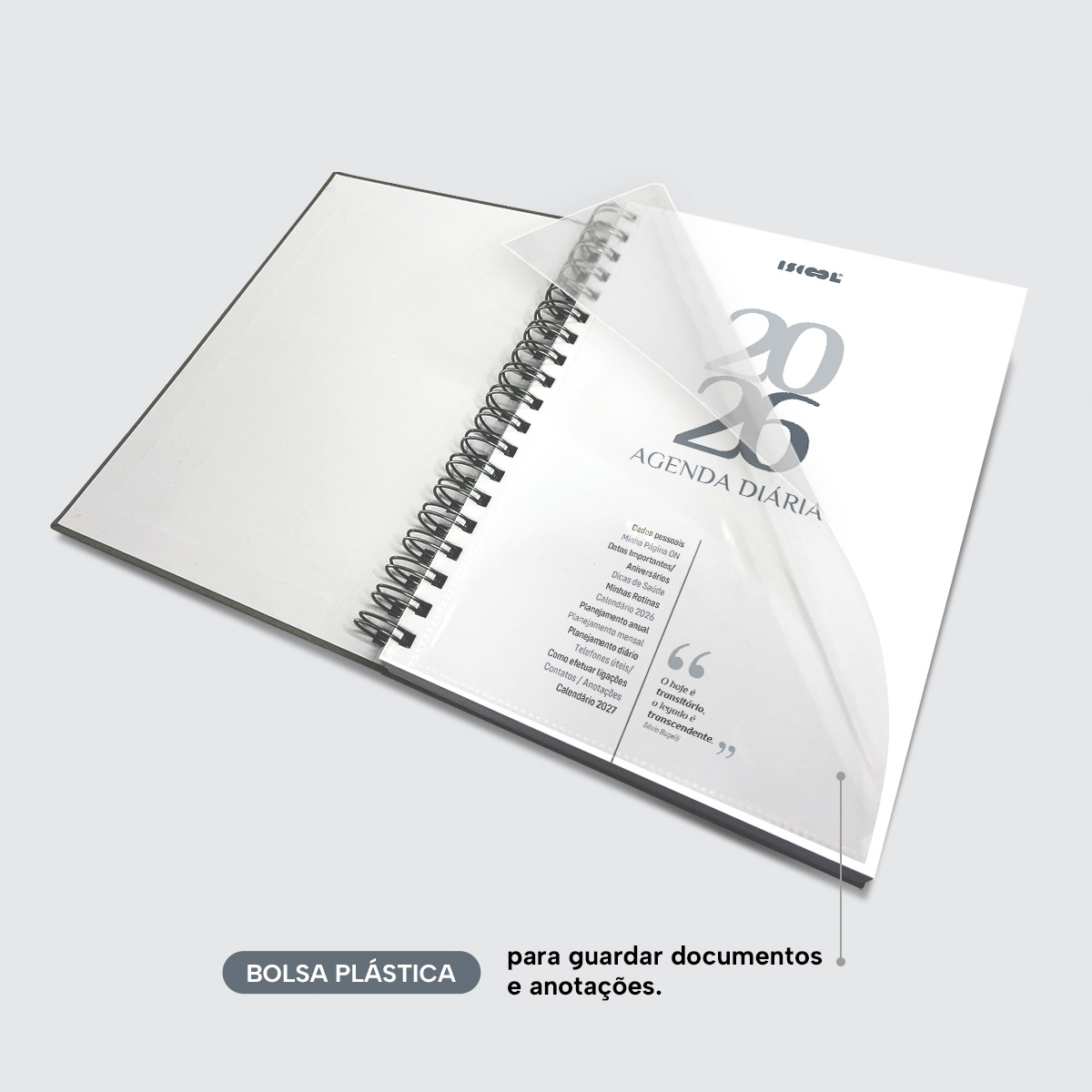 Bolsa plástica para guardar documentos e anotações.
