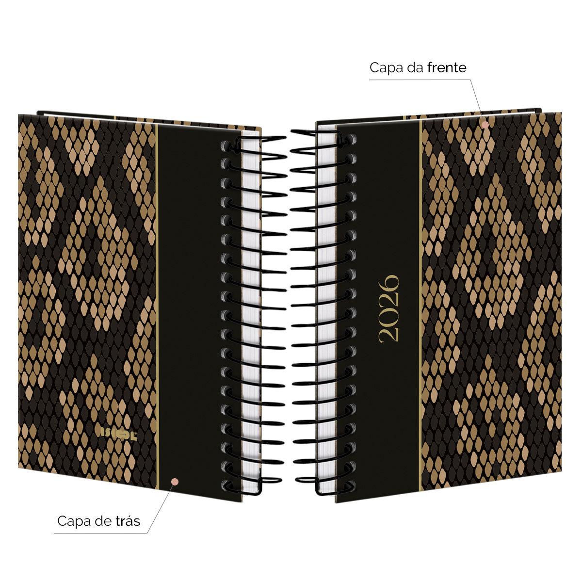 Logo no início, você pode preencher todos os seus dados pessoais, comerciais e emergenciais. Em seguida, há uma visão geral do calendário completo de 2026 e 2027, seguida de um planejamento anual para registrar seus objetivos e metas para cada mês.