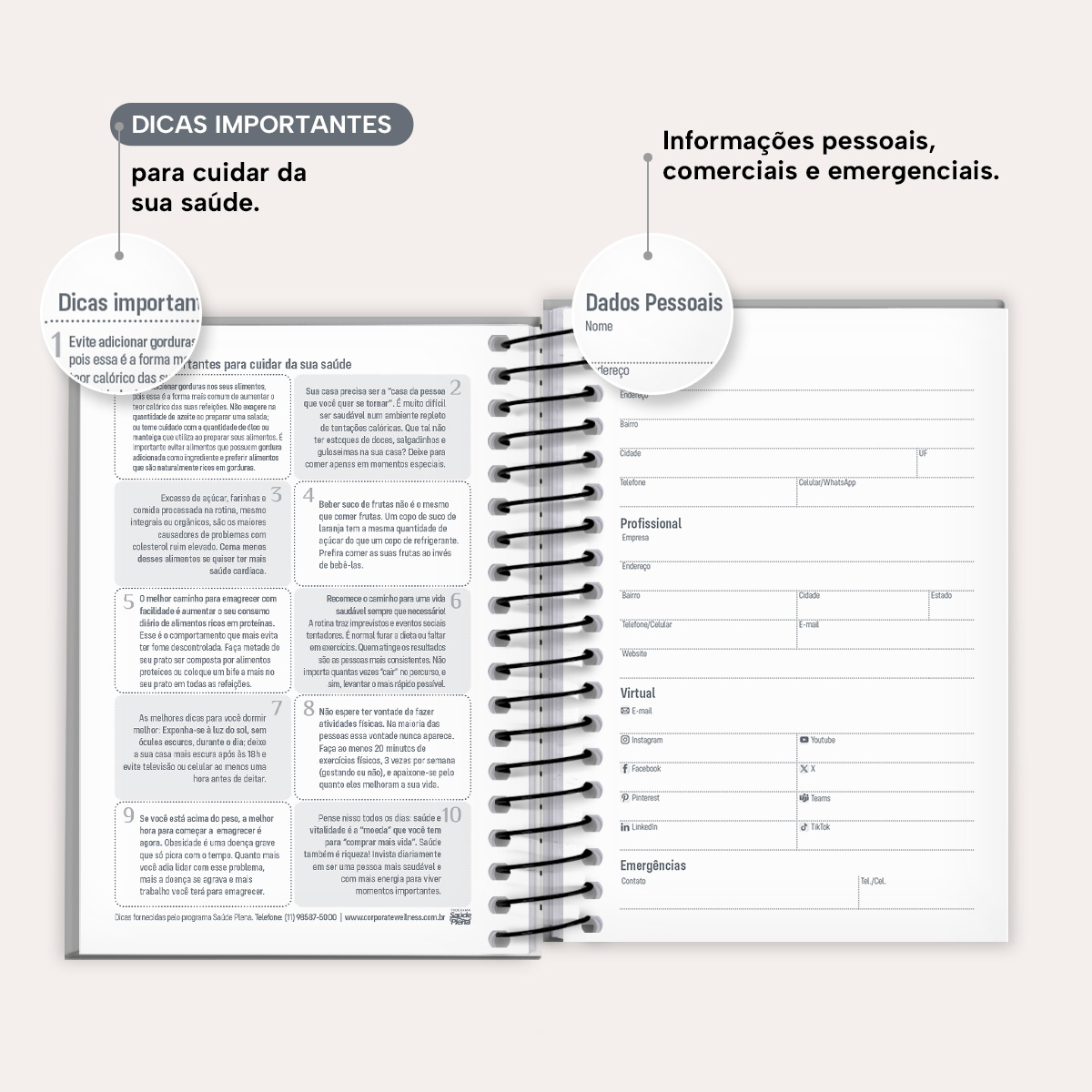 Logo no início, você pode preencher todos os seus dados pessoais, comerciais e emergenciais. Em seguida, há uma visão geral do calendário completo de 2026 e 2027, seguida de um planejamento anual para registrar seus objetivos e metas para cada mês.