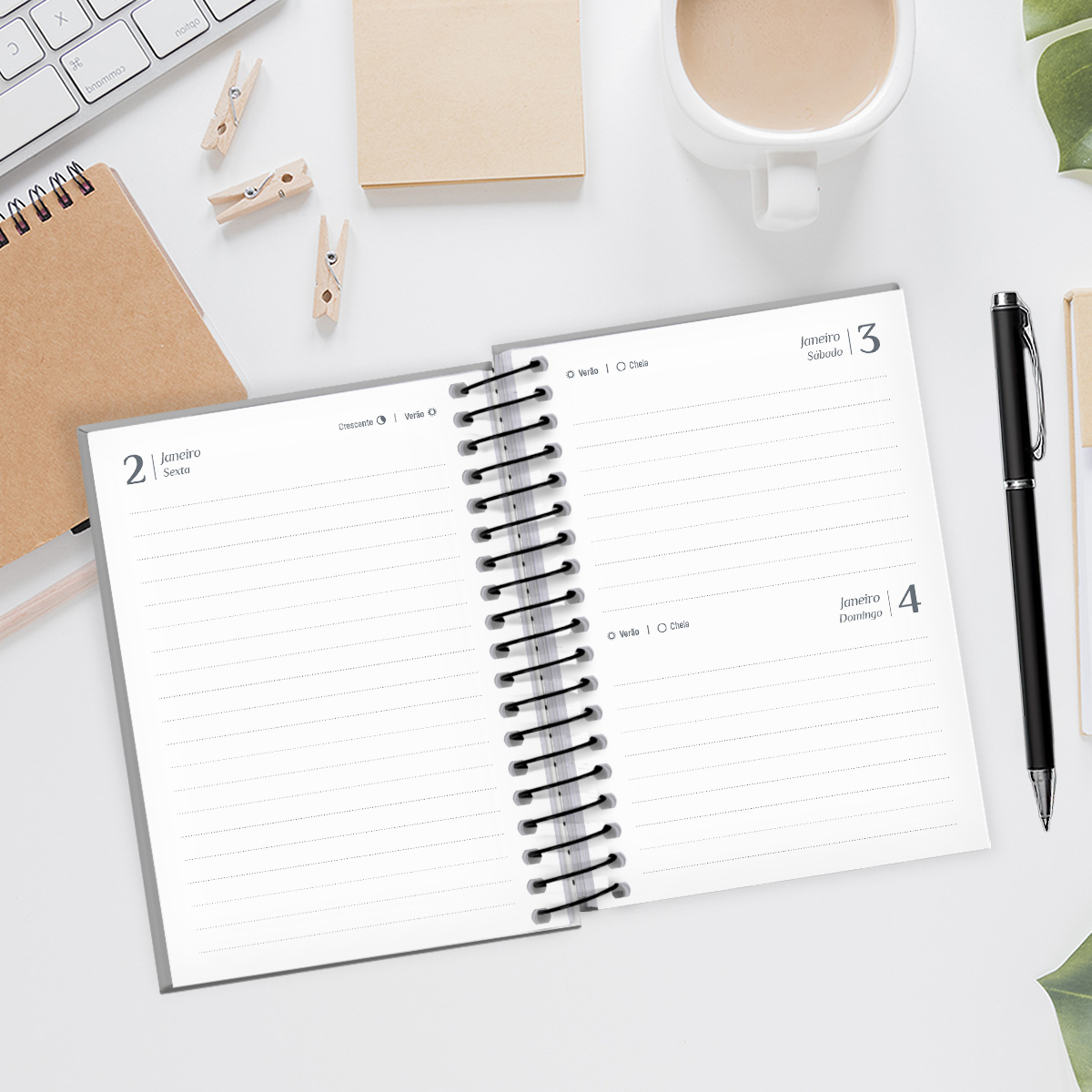Os dias da semana, de segunda a sexta-feira, ocupam páginas inteiras. Você pode inserir manualmente os horários, permitindo flexibilidade para ajustar os compromissos e as linhas conforme sua necessidade. Já nos finais de semana, sábados e domingos compartilham a mesma página, com um espaço maior para o sábado.