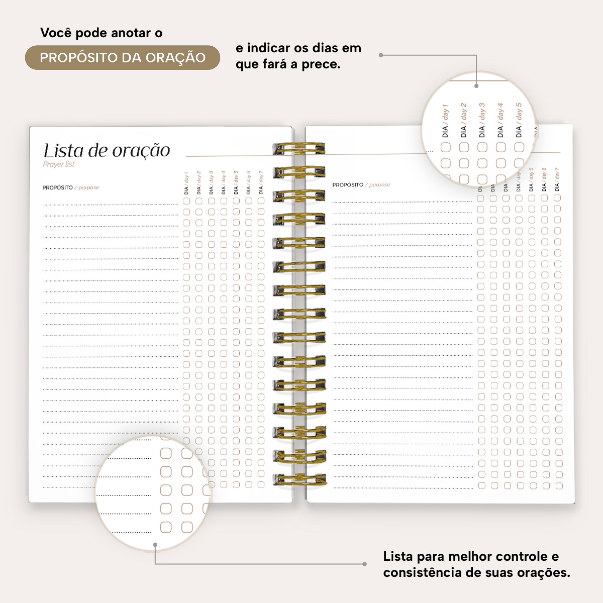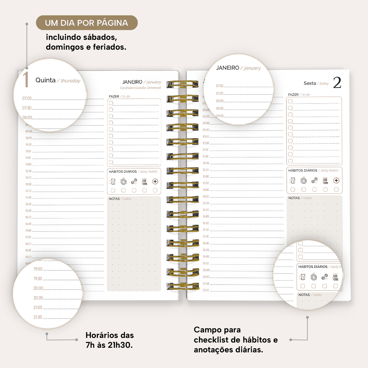 Com tamanho de 14 x 20 cm (próximo ao A5), esta agenda se destaca pelo formato de 1 dia por página, incluindo sábados, domingos e feriados. As linhas possuem marcação de horários a cada 30 minutos, das 7h às 21h30, permitindo uma organização completa do dia. Além disso, cada página oferece espaço para listar suas tarefas do dia (to-do), monitorar hábitos diários e registrar outras anotações importantes.