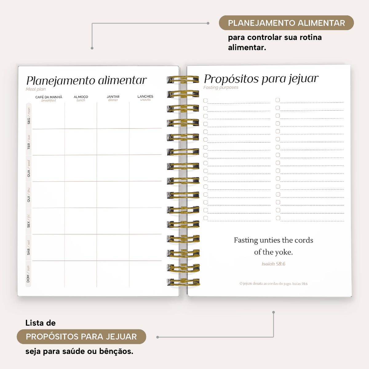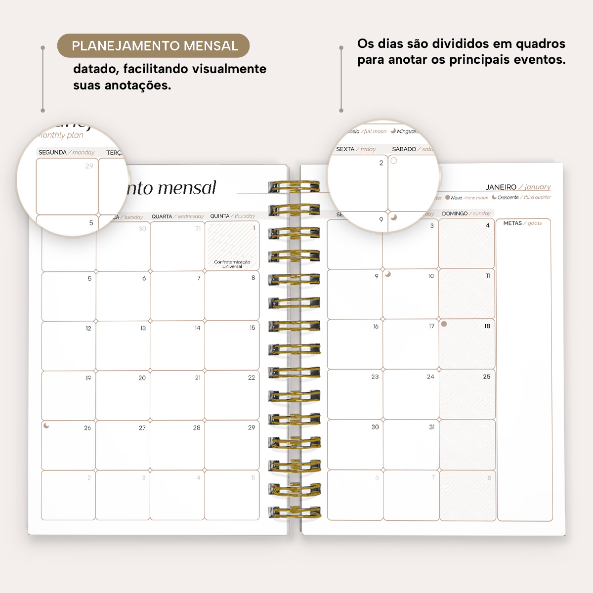 No início de cada mês, você encontra um planejamento mensal com blocos para anotar os principais eventos, uma página para controle de orçamento com receitas e despesas, e um espaço para planejar sua rotina alimentar.