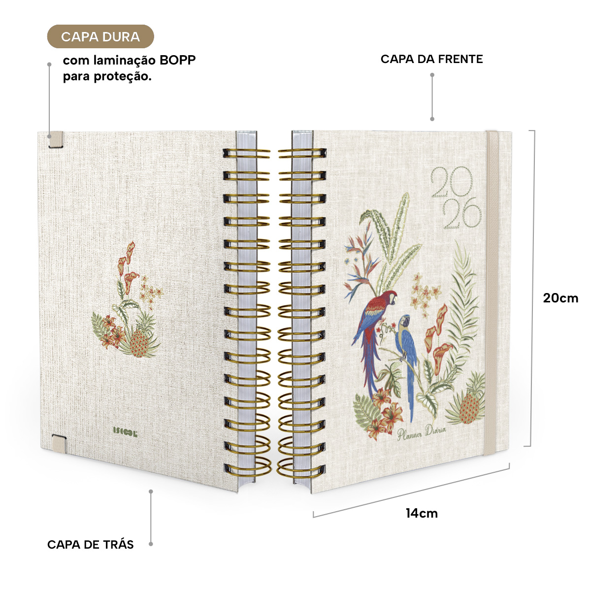 Com tamanho de 14 x 20 cm (próximo ao A5), esta agenda se destaca pelo formato de 1 dia por página, incluindo sábados, domingos e feriados. As linhas possuem marcação de horários a cada 30 minutos, das 7h às 21h30, permitindo uma organização completa do dia. Além disso, cada página oferece espaço para listar suas tarefas do dia (to-do), monitorar hábitos diários e registrar outras anotações importantes.