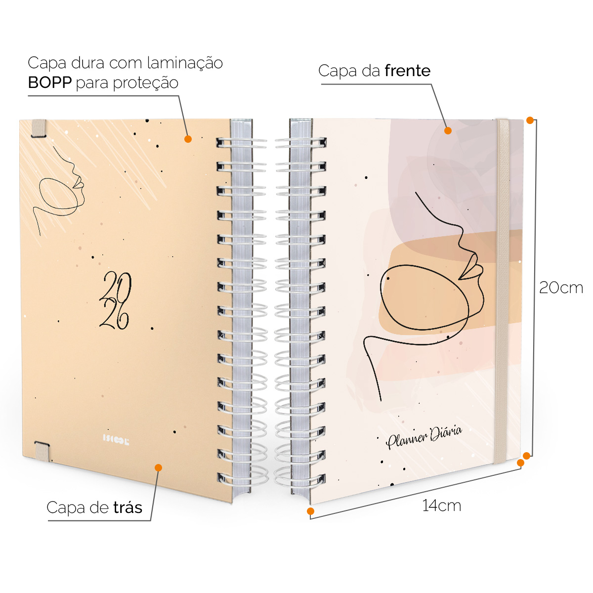 Com tamanho de 14 x 20 cm (próximo ao A5), esta agenda se destaca pelo formato de 1 dia por página, incluindo sábados, domingos e feriados. As linhas possuem marcação de horários a cada 30 minutos, das 7h às 21h30, permitindo uma organização completa do dia. Além disso, cada página oferece espaço para listar suas tarefas do dia (to-do), monitorar hábitos diários e registrar outras anotações importantes.