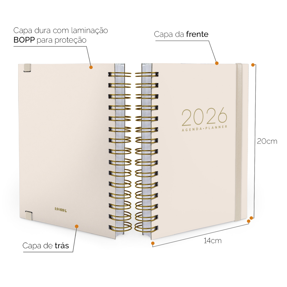 Com tamanho de 14 x 20 cm (próximo ao A5), esta agenda se destaca pelo formato de 1 dia por página, incluindo sábados, domingos e feriados. As linhas possuem marcação de horários a cada 30 minutos, das 7h às 21h30, permitindo uma organização completa do dia. Além disso, cada página oferece espaço para listar suas tarefas do dia (to-do), monitorar hábitos diários e registrar outras anotações importantes.