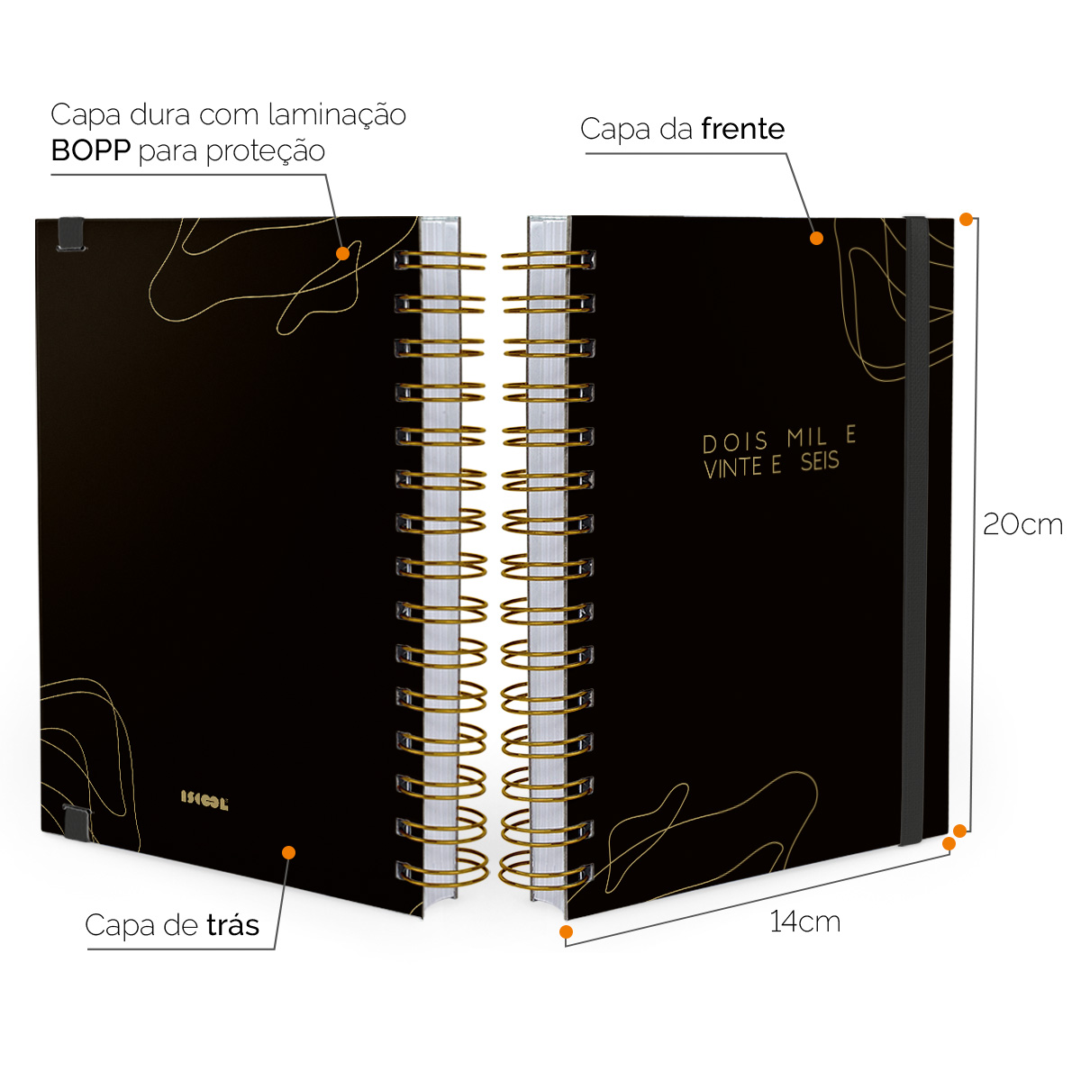 Agenda Planner Diária 2026 Minimalista Linhas Preto Dourado