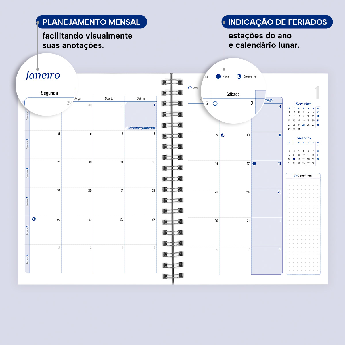 Além disso, cada página possui indicação de feriados, das estações do ano, calendário lunar, indicador do número da semana e frases inspiradoras.