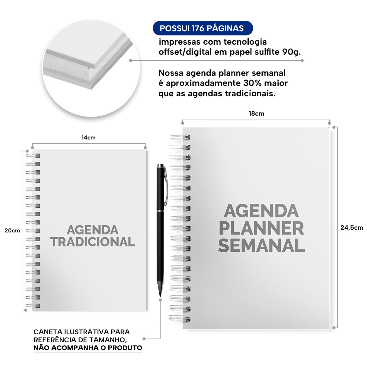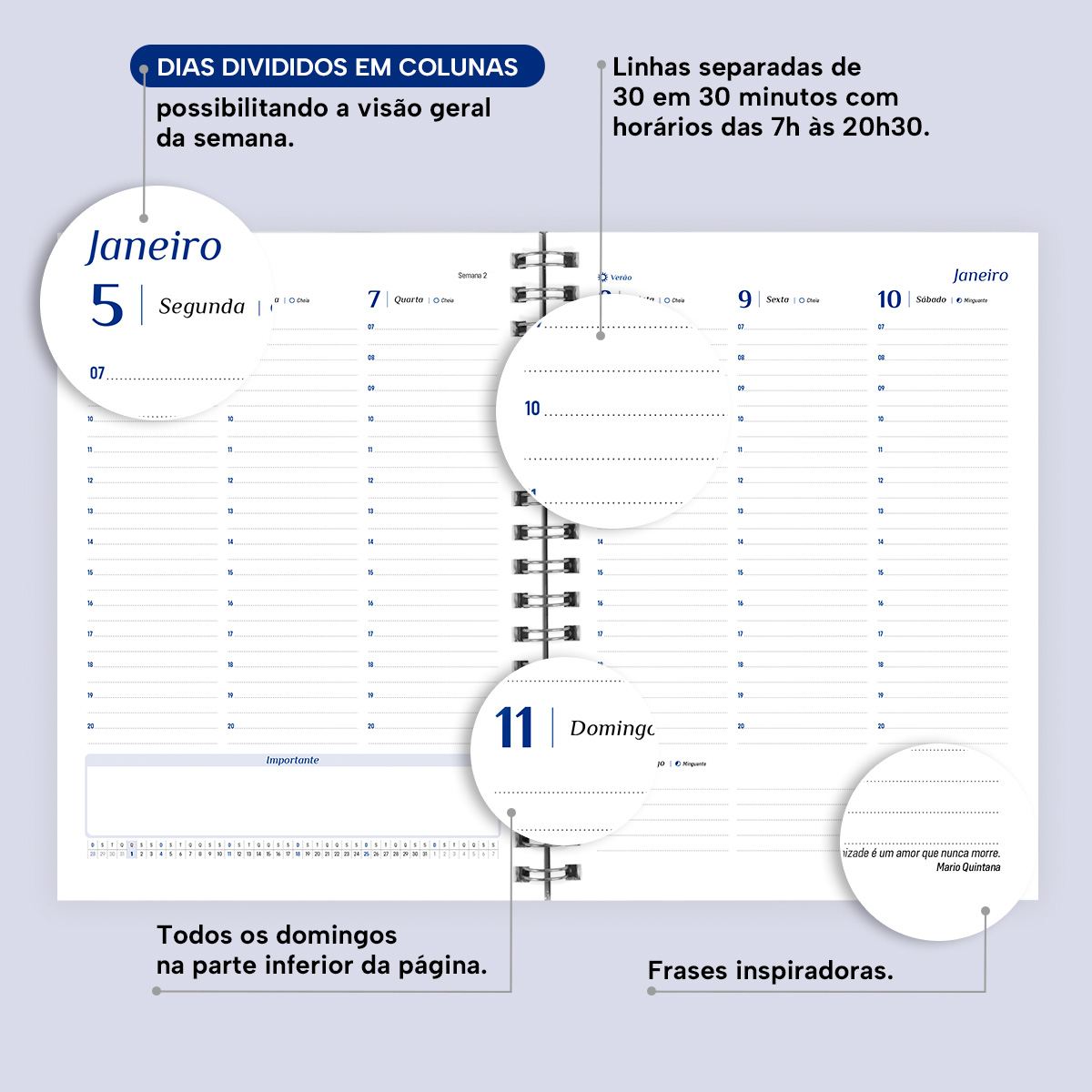 Com o tamanho de 18 x 24,5 cm, ela é 30% maior que os modelos tradicionais, e o grande diferencial dessa linha é a visão completa da semana, com os dias separados em colunas, onde as linhas possuem marcação dos horários divididos de 1 em 1 hora, que vão das 7h às 20h, abrangendo o dia todo. E ainda é possível incluir manualmente horários intermediários, por exemplo: 7h30.