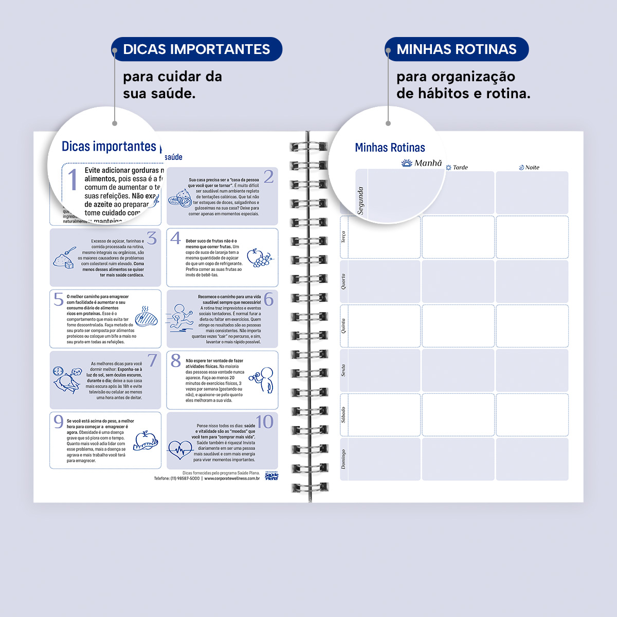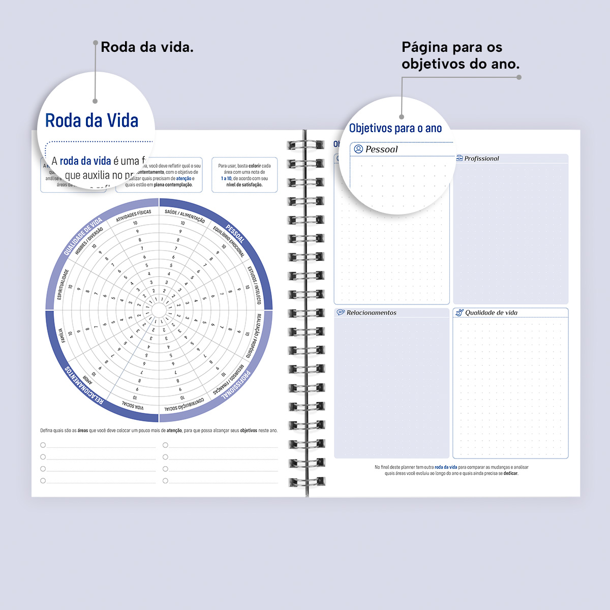 Ao final da agenda, há uma página com os principais números de telefone úteis, além de instruções sobre como efetuar ligações, uma agenda de contatos, um balanço financeiro anual, uma página com a ferramenta “Roda da Vida” para você comparar sua evolução pessoal em relação ao início do ano e o termômetro de metas, onde você poderá apurar os resultados de cada mês e fazer uma autoavaliação.