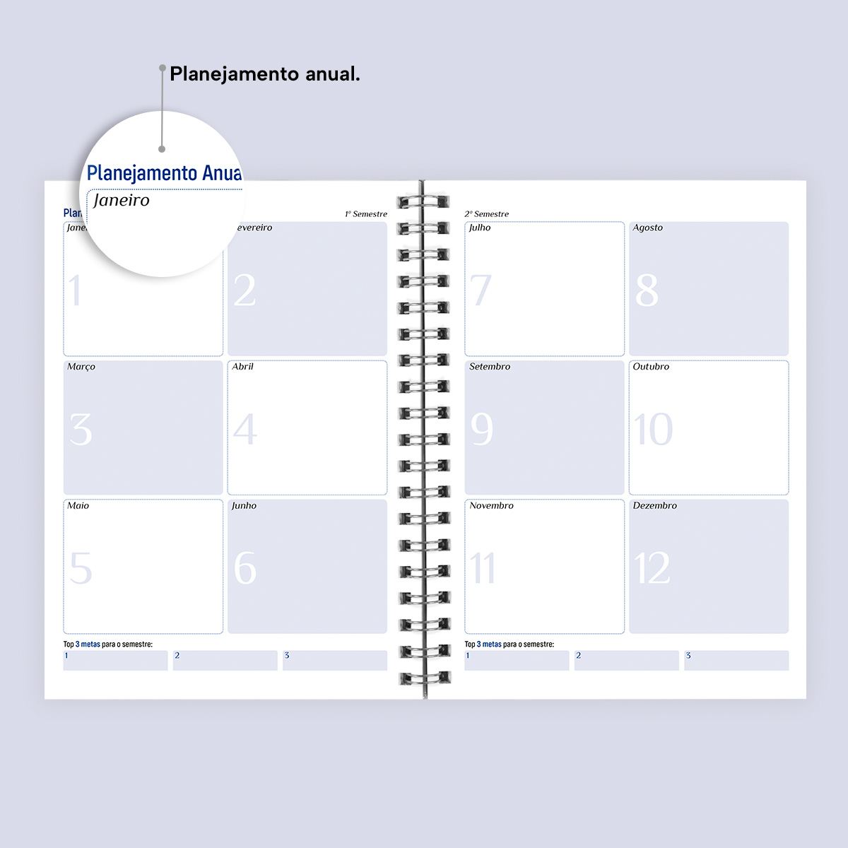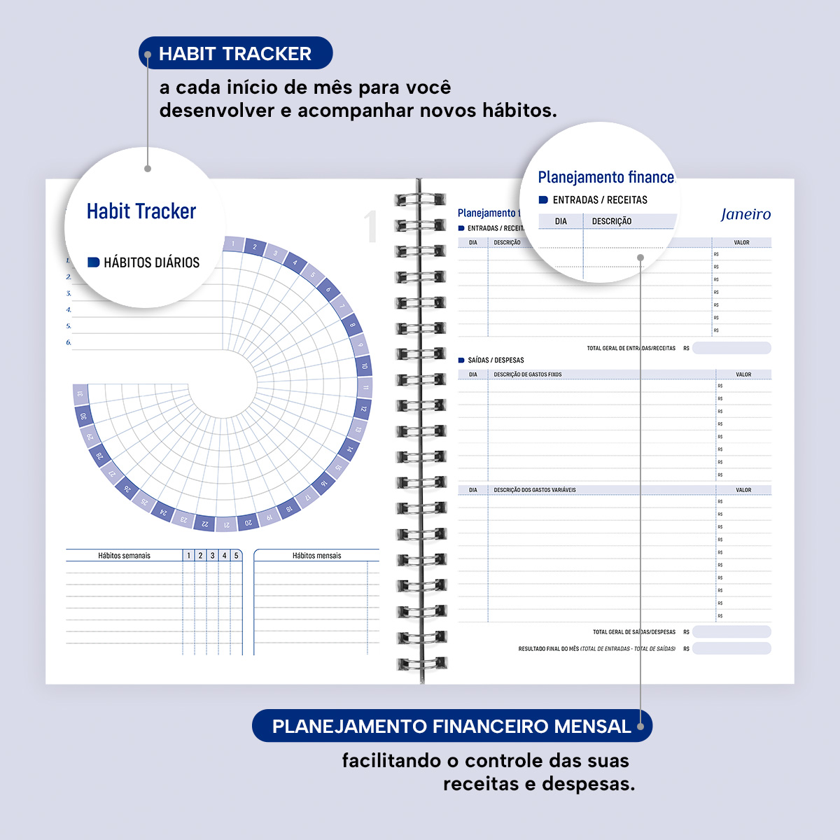 No início de cada mês, há um planejamento mensal, facilitando visualmente as suas principais anotações, um “Habit Tracker” para você desenvolver novos hábitos ou controlar os mais importantes, e ainda um planejamento financeiro, facilitando o controle das suas receitas e despesas.