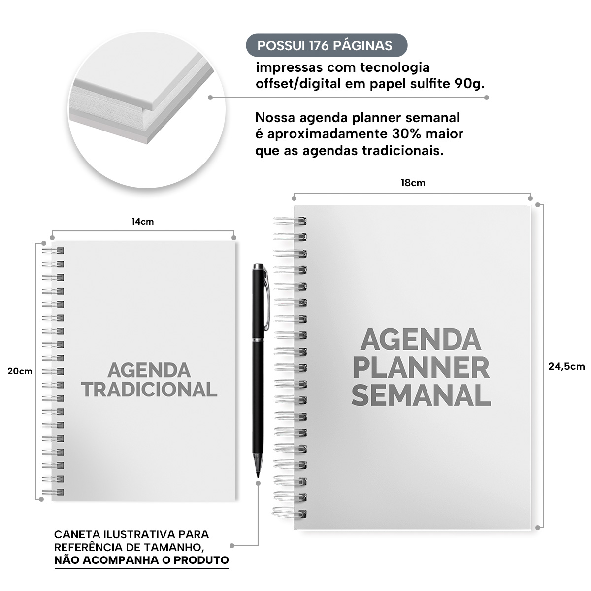 Com o tamanho de 18 x 24,5 cm, ela é 30% maior que os modelos tradicionais, e o grande diferencial dessa linha é a visão completa da semana, com os dias separados em colunas, onde as linhas possuem marcação dos horários divididos de 1 em 1 hora, que vão das 7h às 20h, abrangendo o dia todo. E ainda é possível incluir manualmente horários intermediários, por exemplo: 7h30.