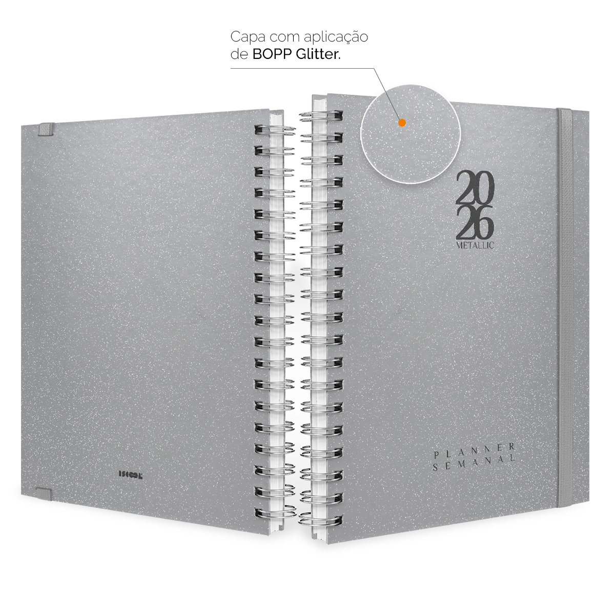Agenda Planner Semanal Plus 2026 Solid Glitter Metallic Prata