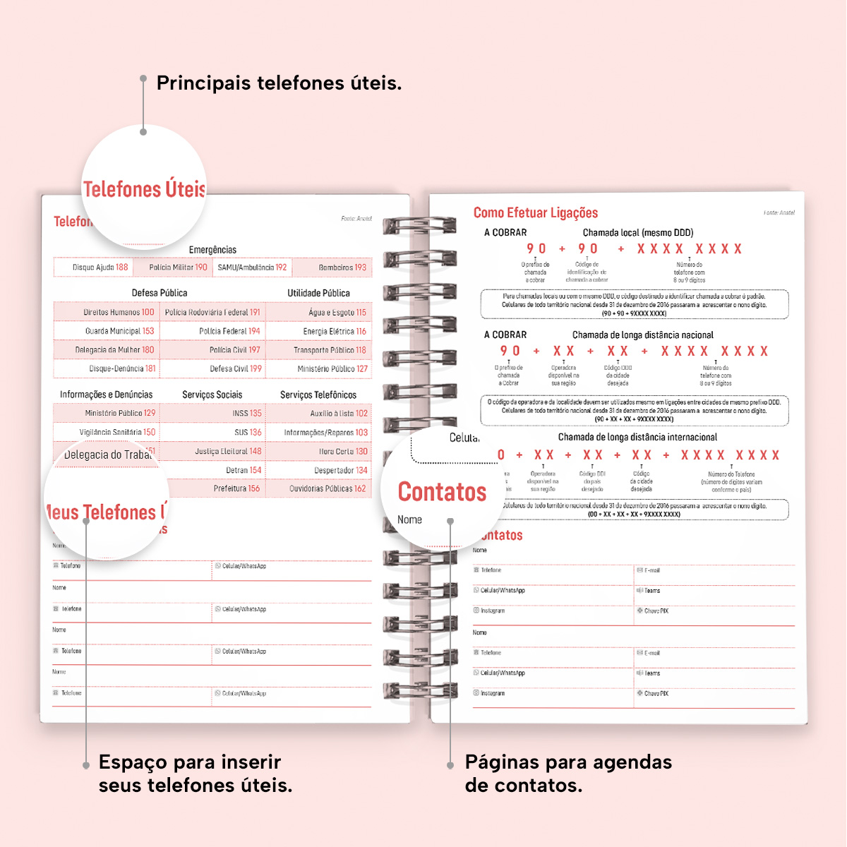Ao final da agenda, há uma página com os principais números de telefone úteis, além de instruções sobre como efetuar ligações, uma seção dedicada a contatos, uma página em formato “bullet list” para itens de lista, páginas para anotações livres e um mapa do Brasil.