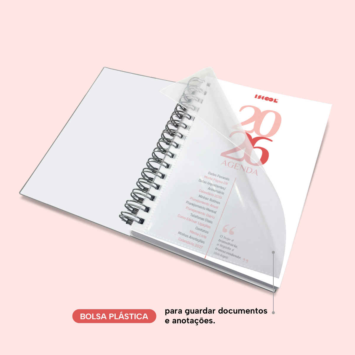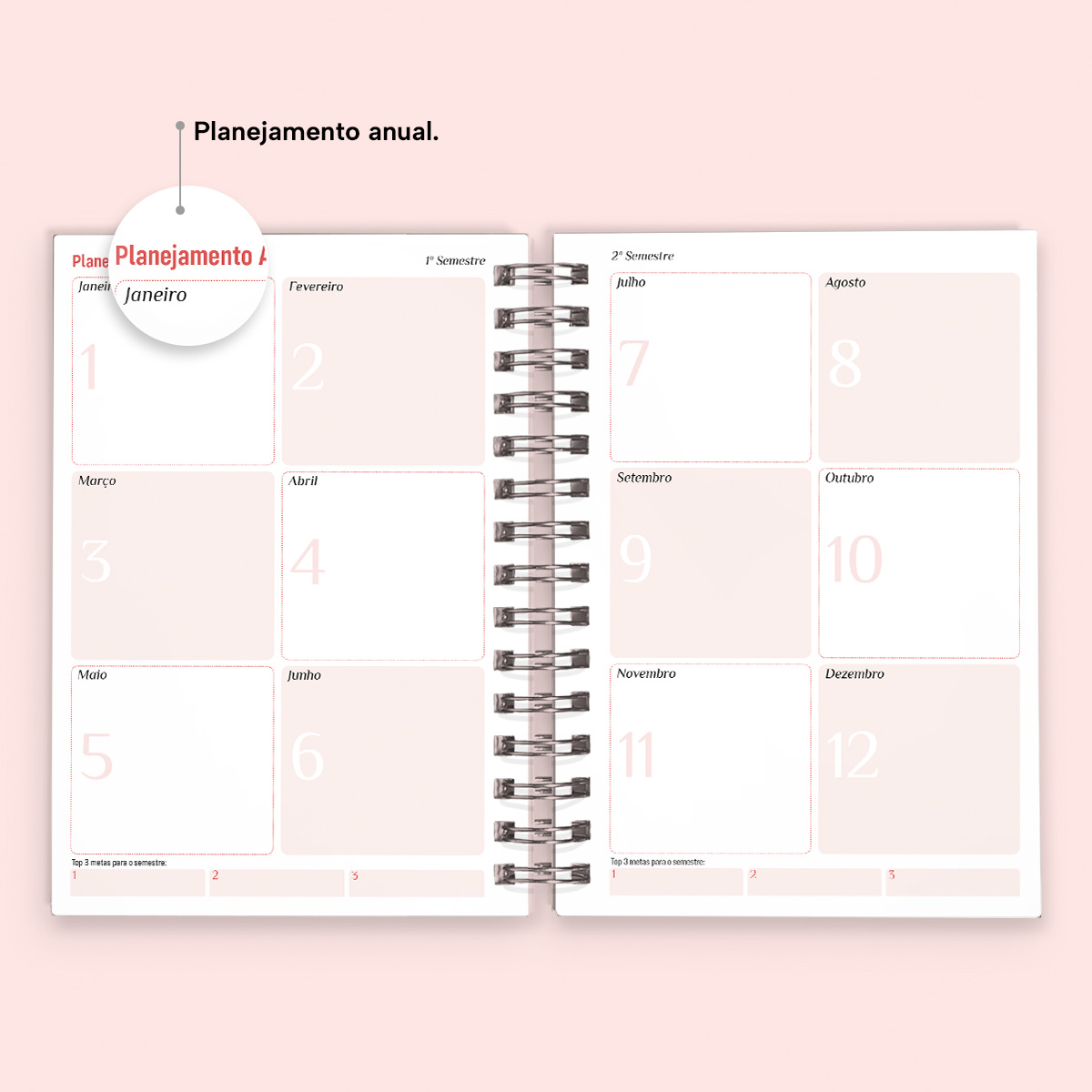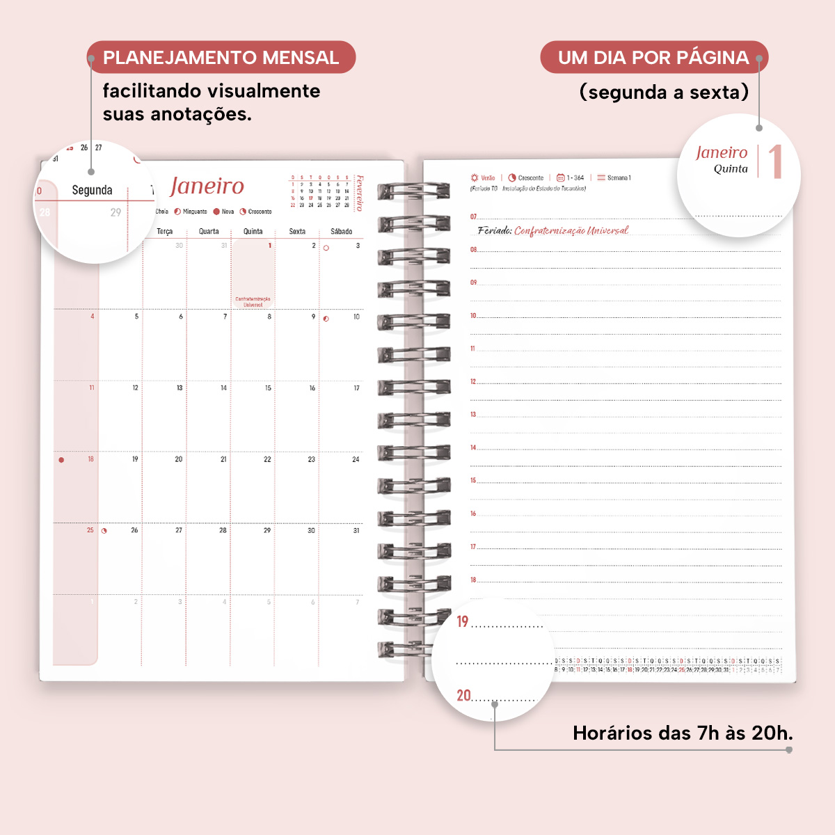 A cada mês, você pode contar com uma página de planejamento mensal, facilitando a visualização de suas principais anotações. Além disso, cada página possui indicações de feriados, estações do ano, calendário lunar, número da semana, frases inspiradoras e um calendário linear do mês no rodapé.