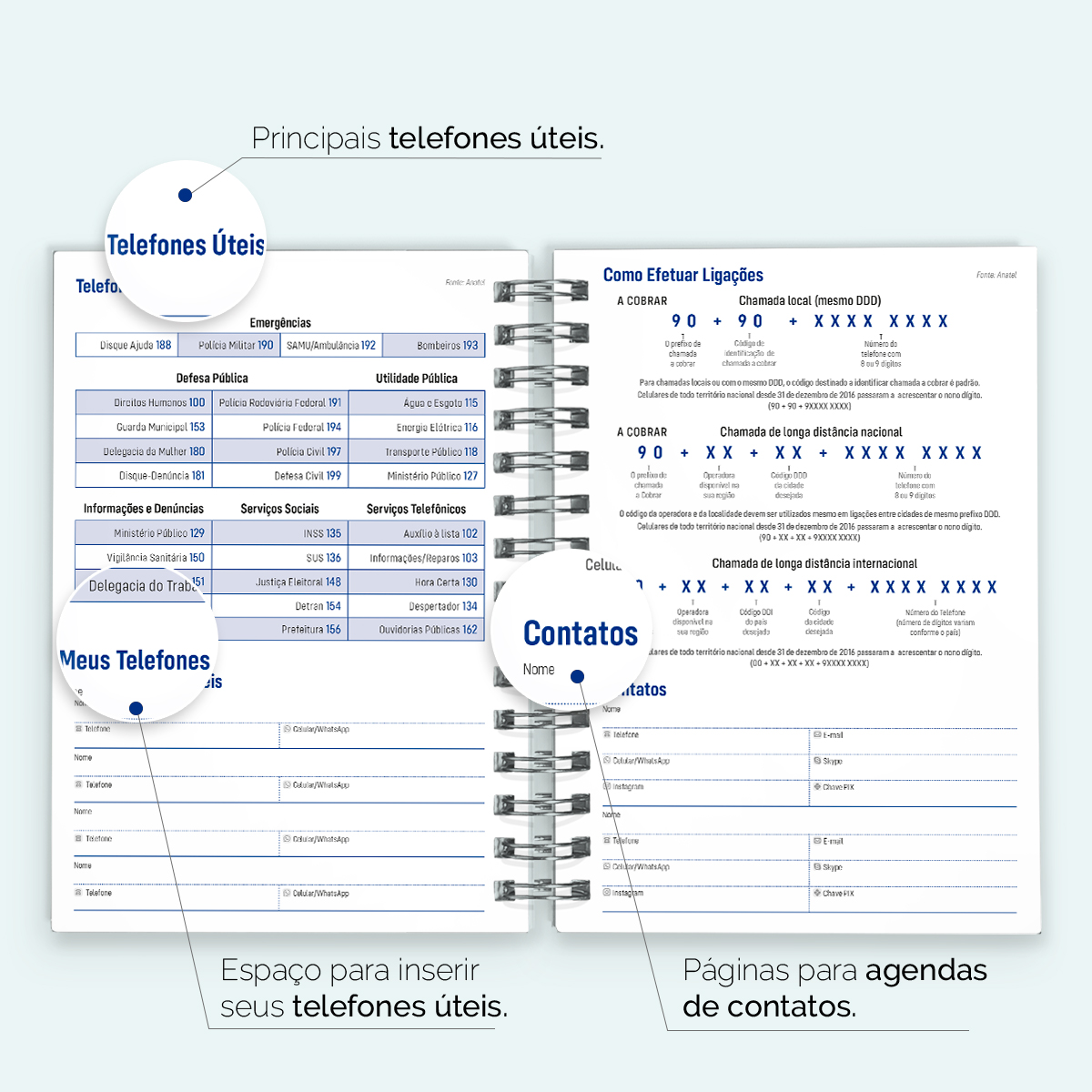 Ao final da agenda, há uma página com os principais números de telefone úteis, além de instruções sobre como efetuar ligações, uma seção dedicada a contatos, uma página em formato “bullet list” para itens de lista, páginas para anotações livres e um mapa do Brasil.