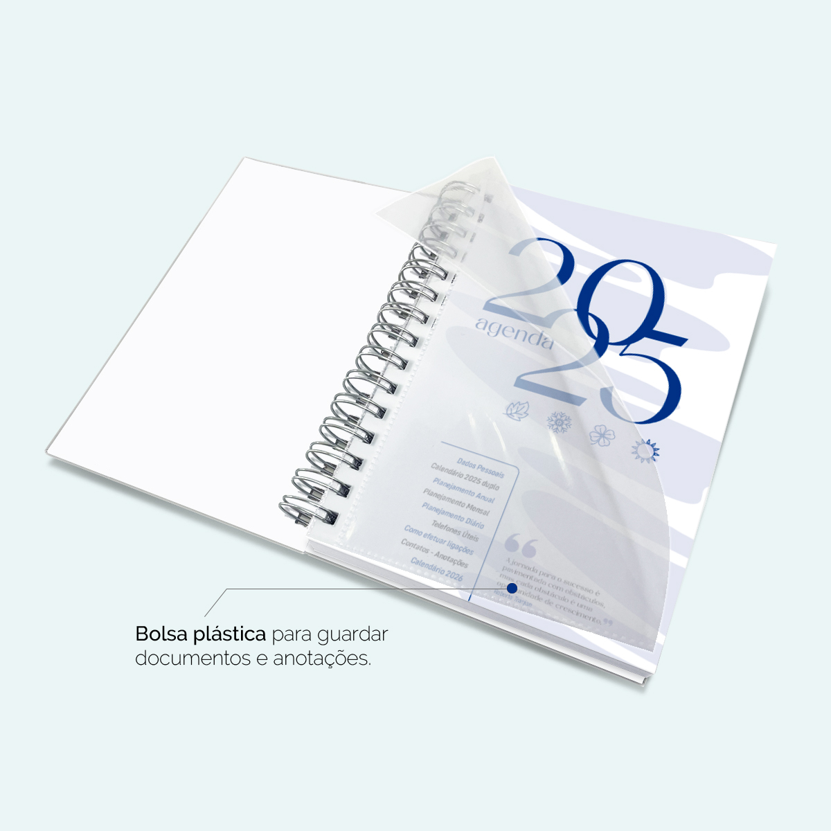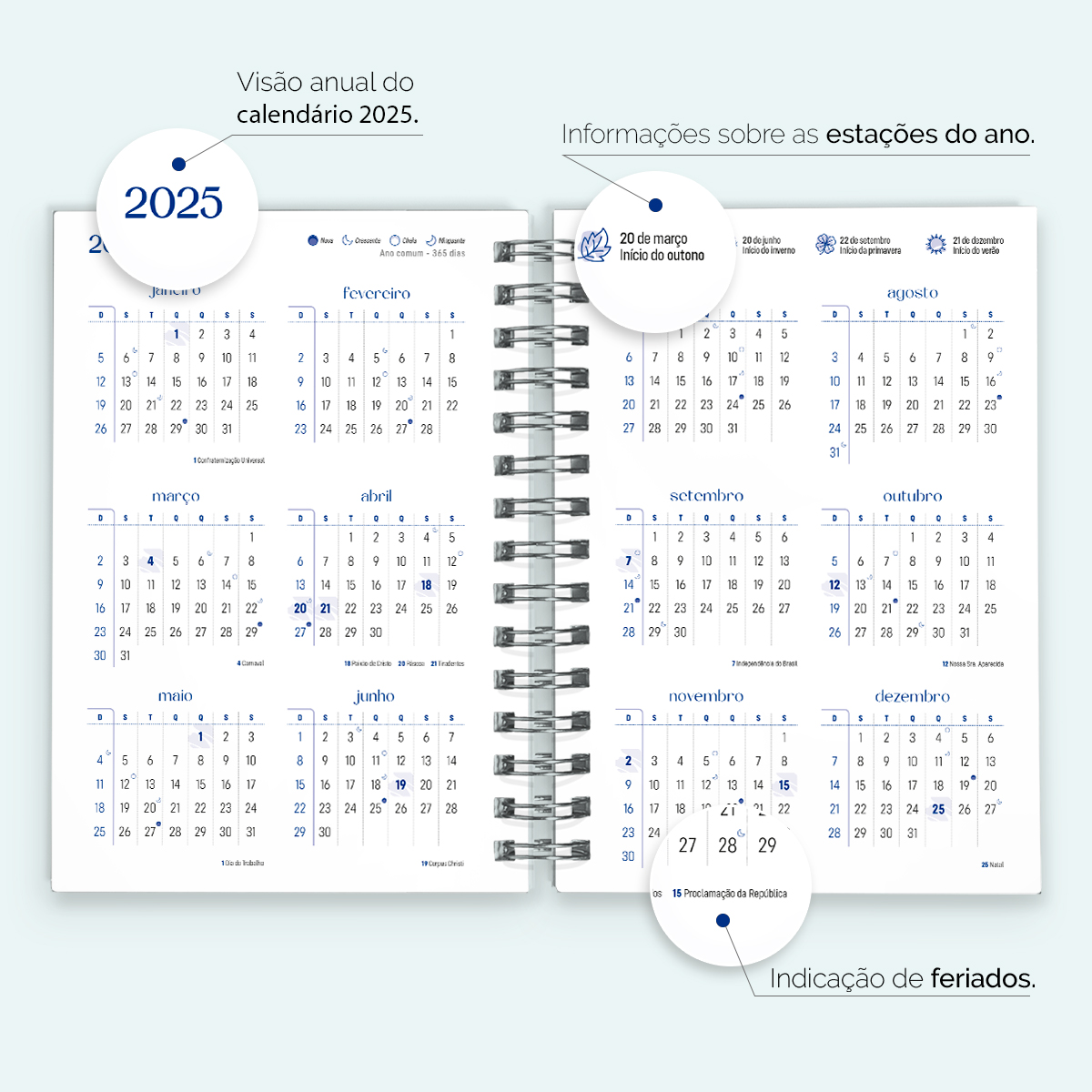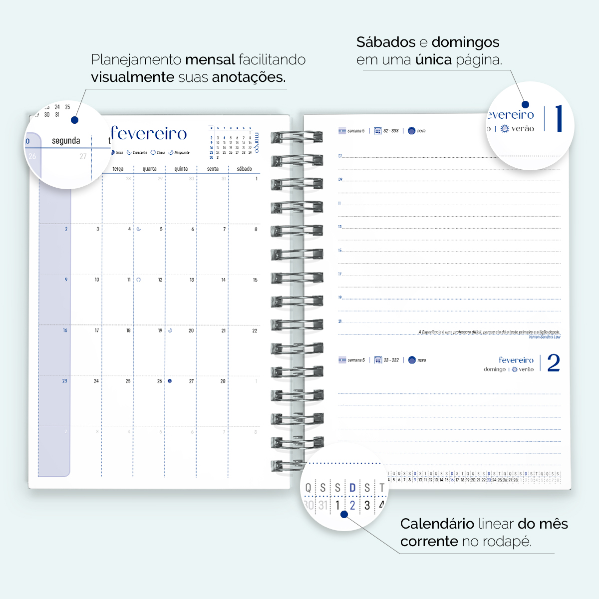 A cada mês, você pode contar com uma página de planejamento mensal, facilitando a visualização de suas principais anotações. Além disso, cada página possui indicações de feriados, estações do ano, calendário lunar, número da semana, frases inspiradoras e um calendário linear do mês no rodapé.