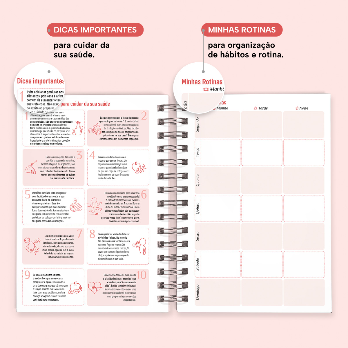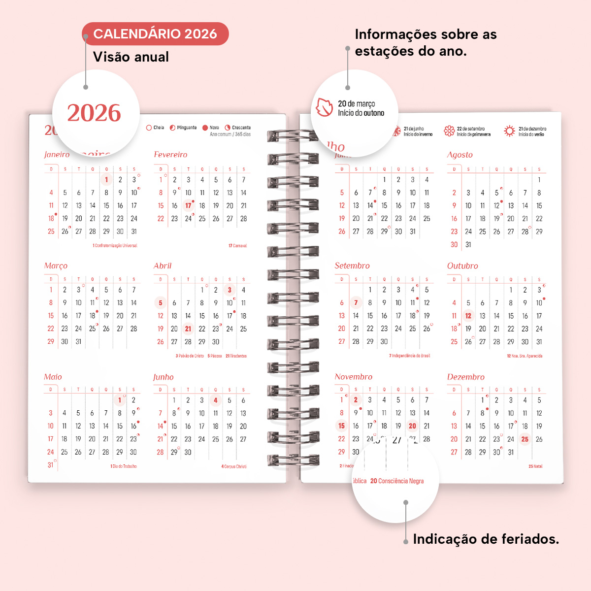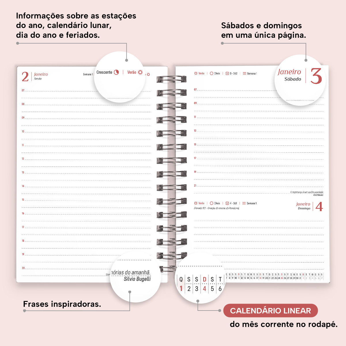 A cada mês, você pode contar com uma página de planejamento mensal, facilitando a visualização de suas principais anotações. Além disso, cada página possui indicações de feriados, estações do ano, calendário lunar, número da semana, frases inspiradoras e um calendário linear do mês no rodapé.
