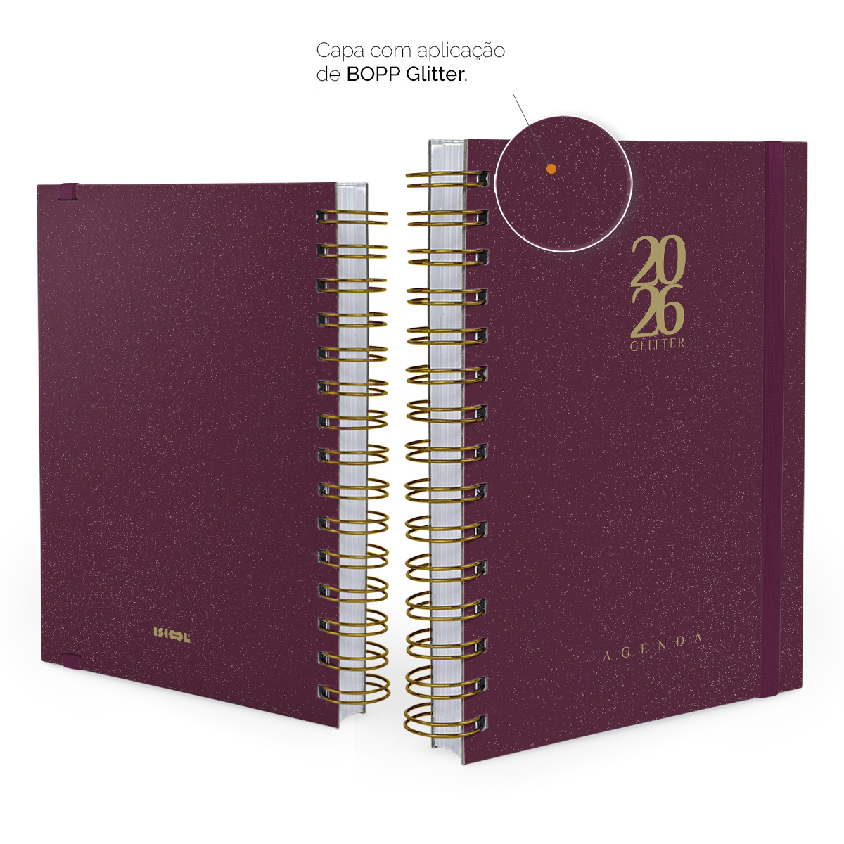 Nossa agenda possui um acabamento especial com BOPP glitter que proporciona o efeito de brilho glitter que se destaca sob luz intensa, e o melhor de tudo é que o glitter não solta!