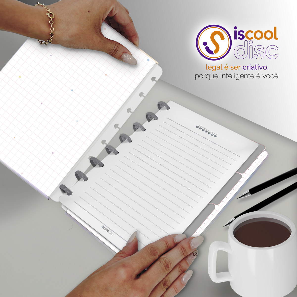 Com furos no formato de "cogumelo", é compatível com outros fabricantes de cadernos de disco, inclusive da marca Caderno Inteligente®.