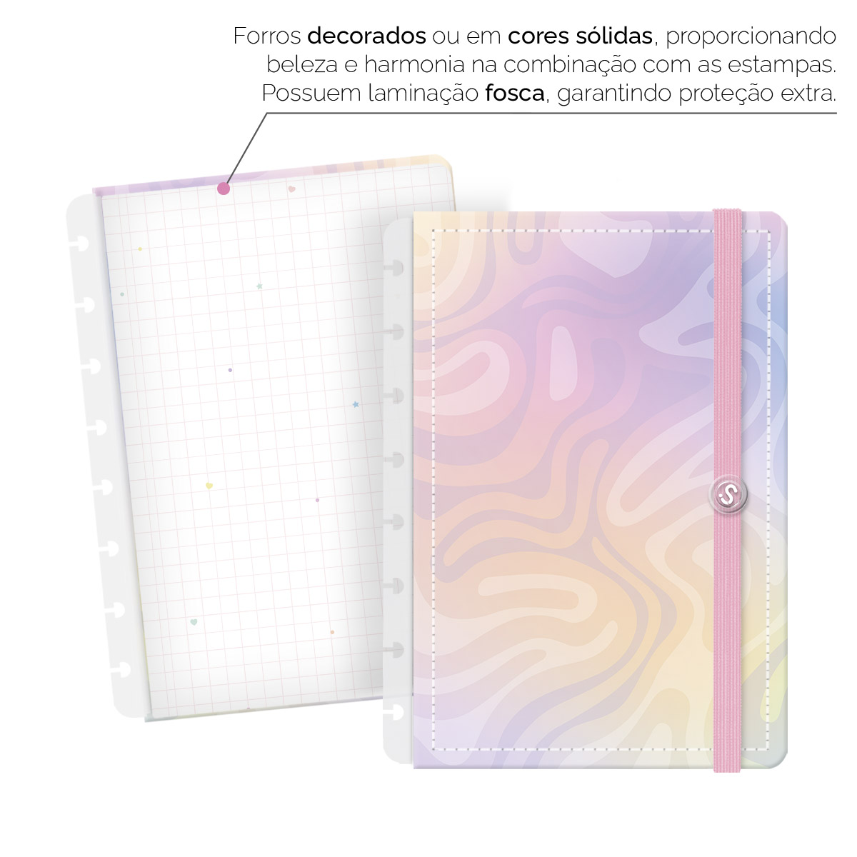 Com as capas iscool Prime, você pode renovar a “cara” do seu caderno de disco sempre que desejar! A caixa inclui capa e contracapa, além de extras que fazem toda a diferença: elástico para fechamento da capa, folha de dados e calendário.