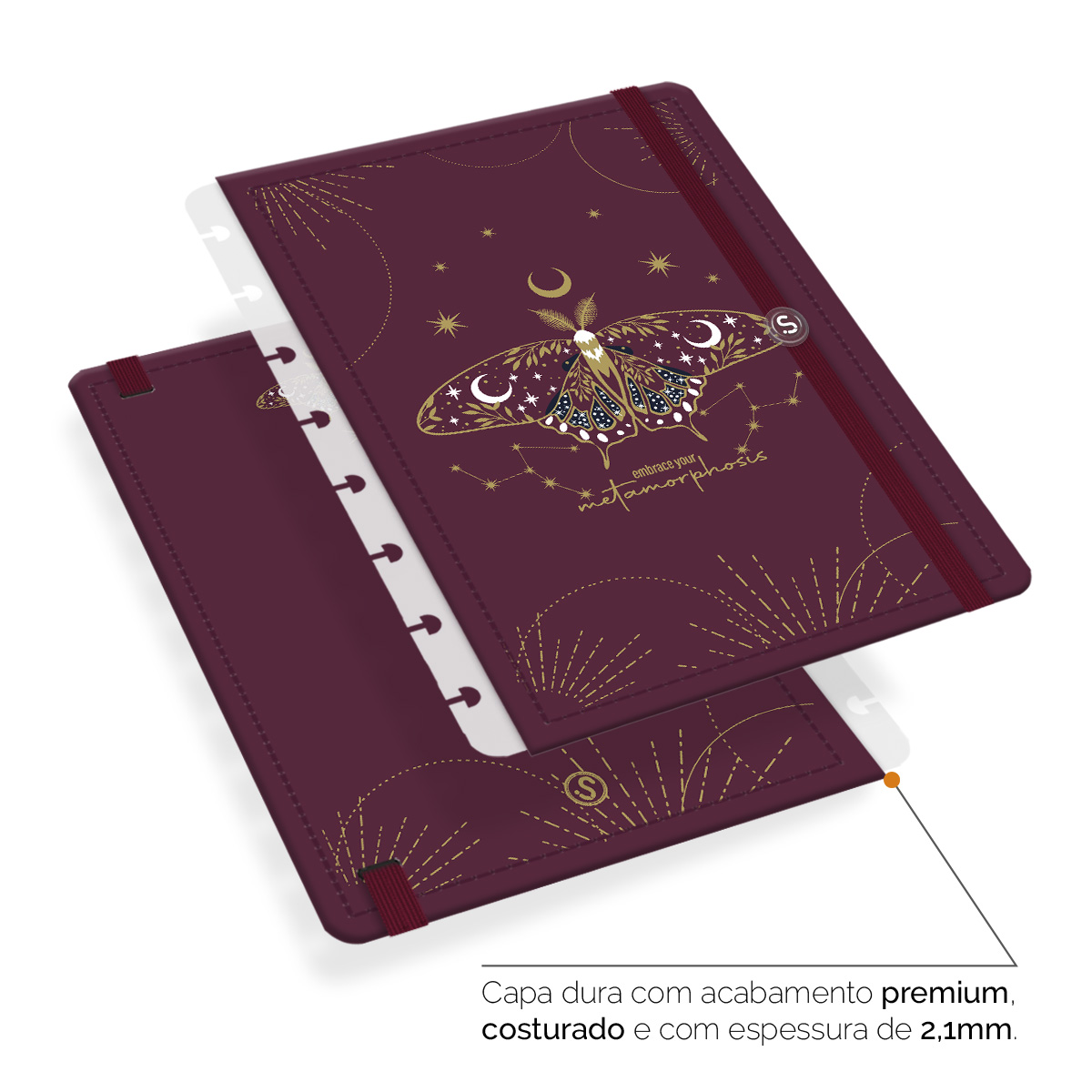 - Capa dura com acabamento premium, costurada e com espessura de 2,1 mm.