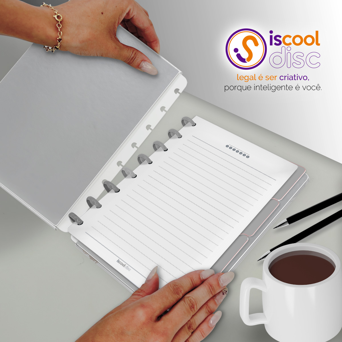 Com furos no formato de "cogumelo", é compatível com outros fabricantes de cadernos de disco, inclusive da marca Caderno Inteligente®.