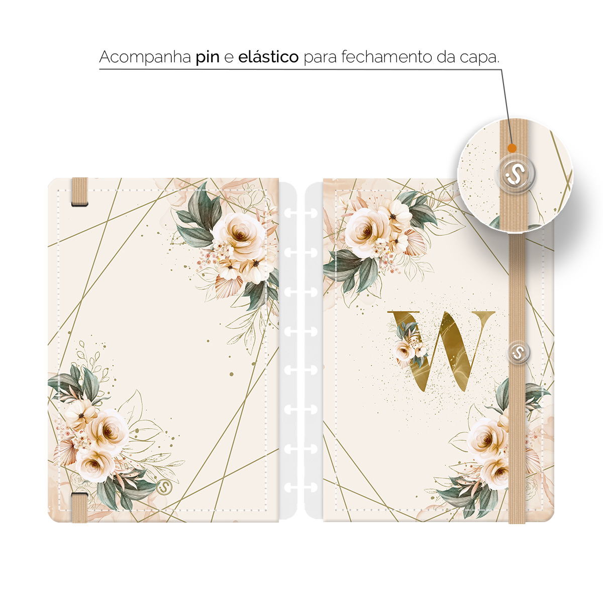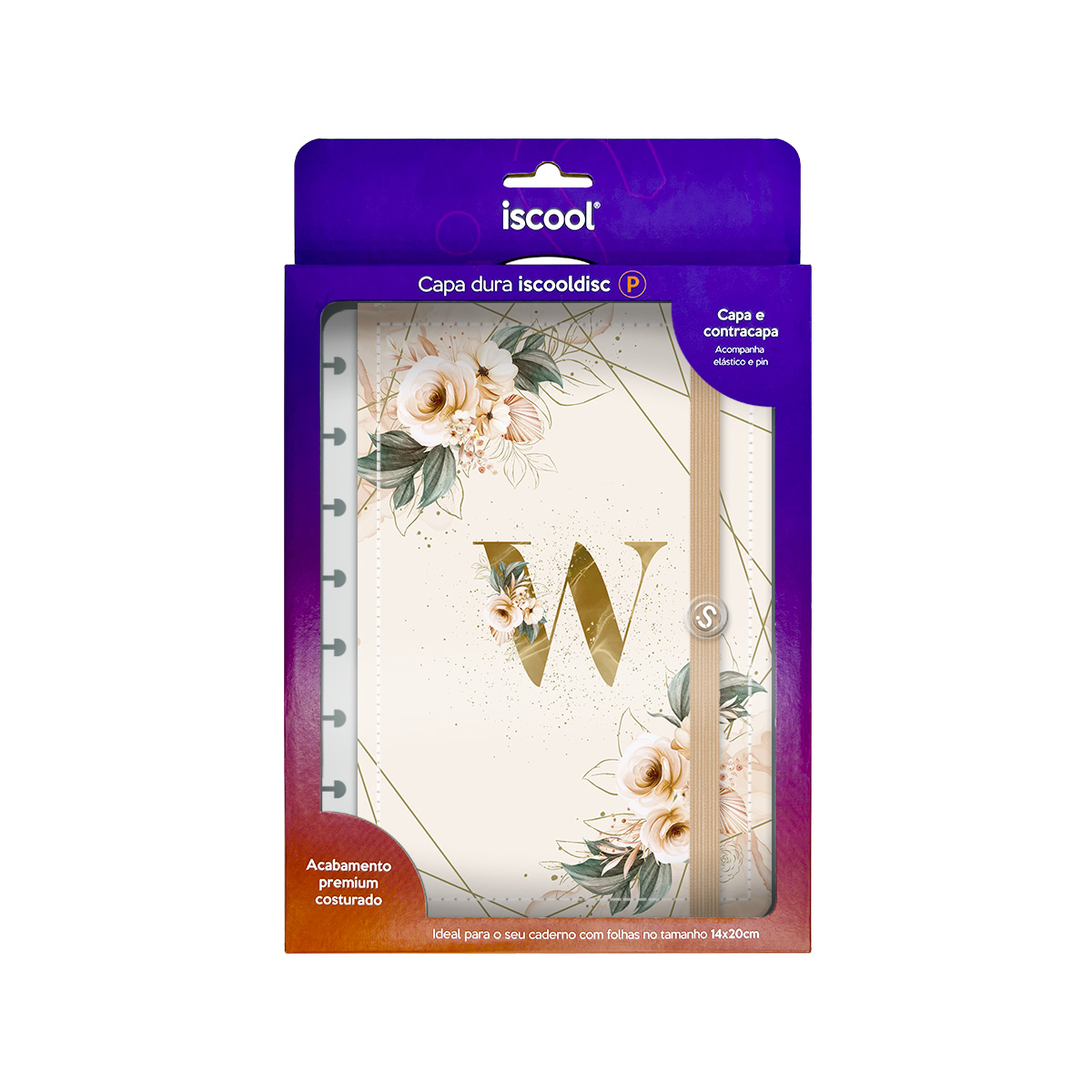 Capa e Contracapa Iscool Disc Monograma Floral Nude e Dourado Letra W