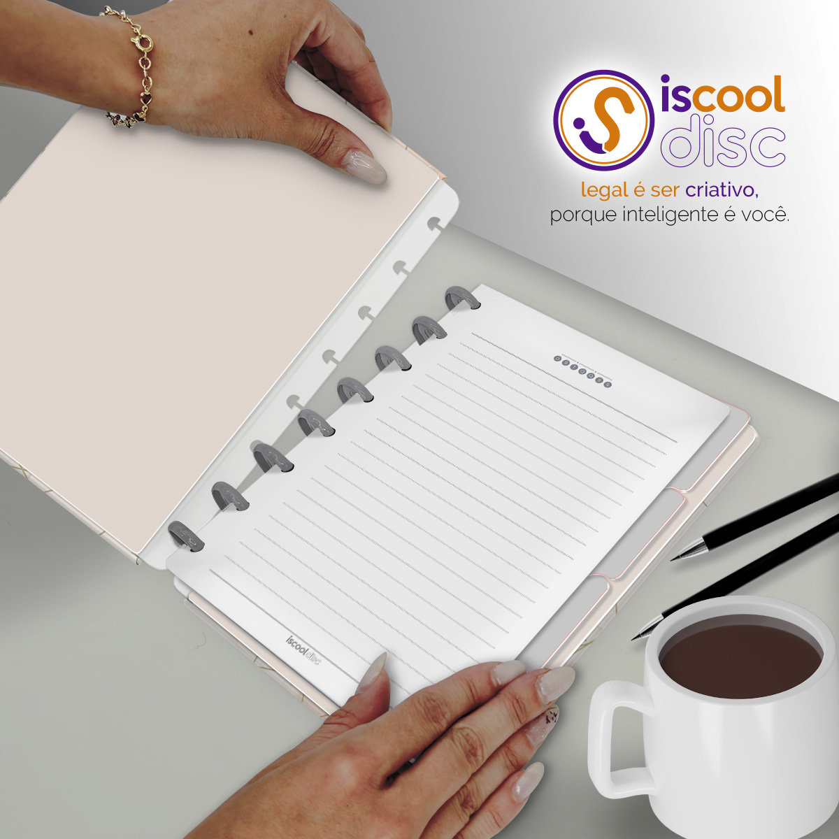 Com furos no formato de "cogumelo", é compatível com outros fabricantes de cadernos de disco, inclusive da marca Caderno Inteligente®.