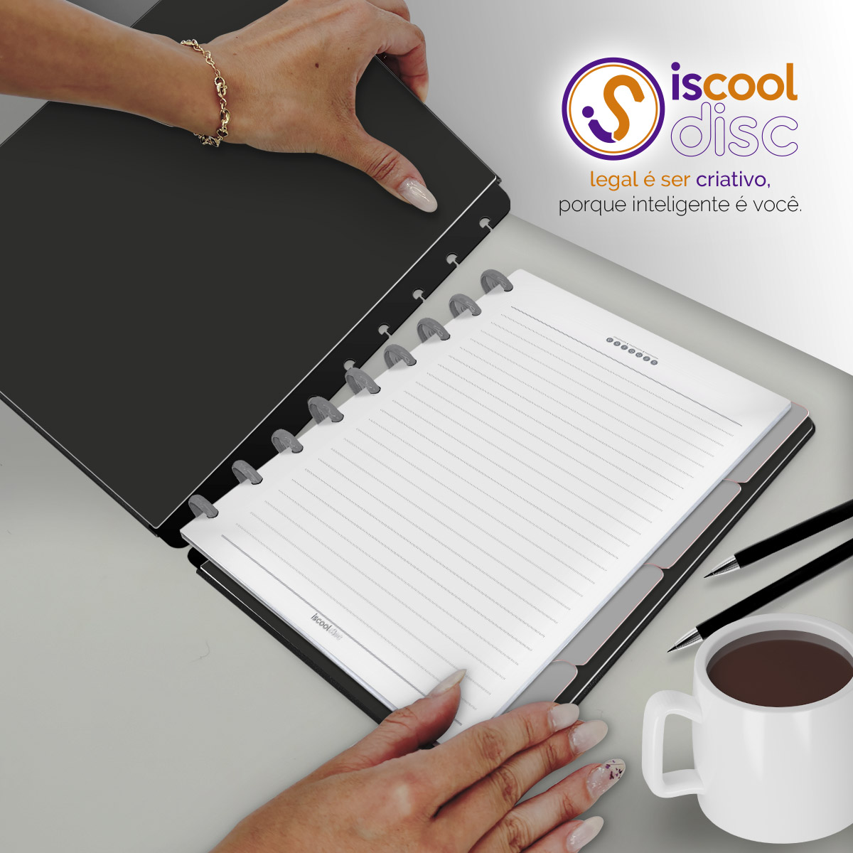 Com furos no formato de "cogumelo", é compatível com outros fabricantes de cadernos de disco, inclusive da marca Caderno Inteligente®.