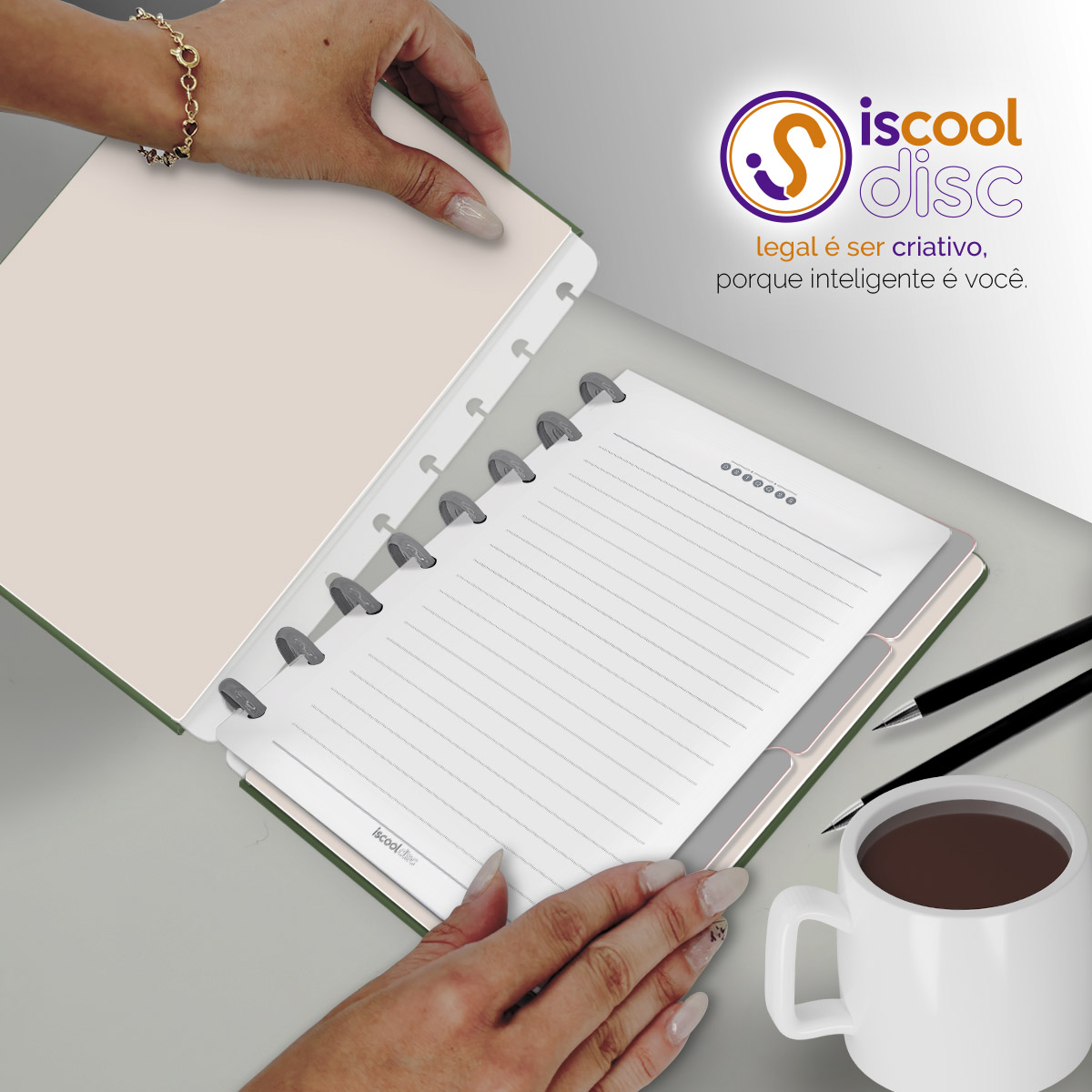 Com furos no formato de "cogumelo", é compatível com outros fabricantes de cadernos de disco, inclusive da marca Caderno Inteligente®.