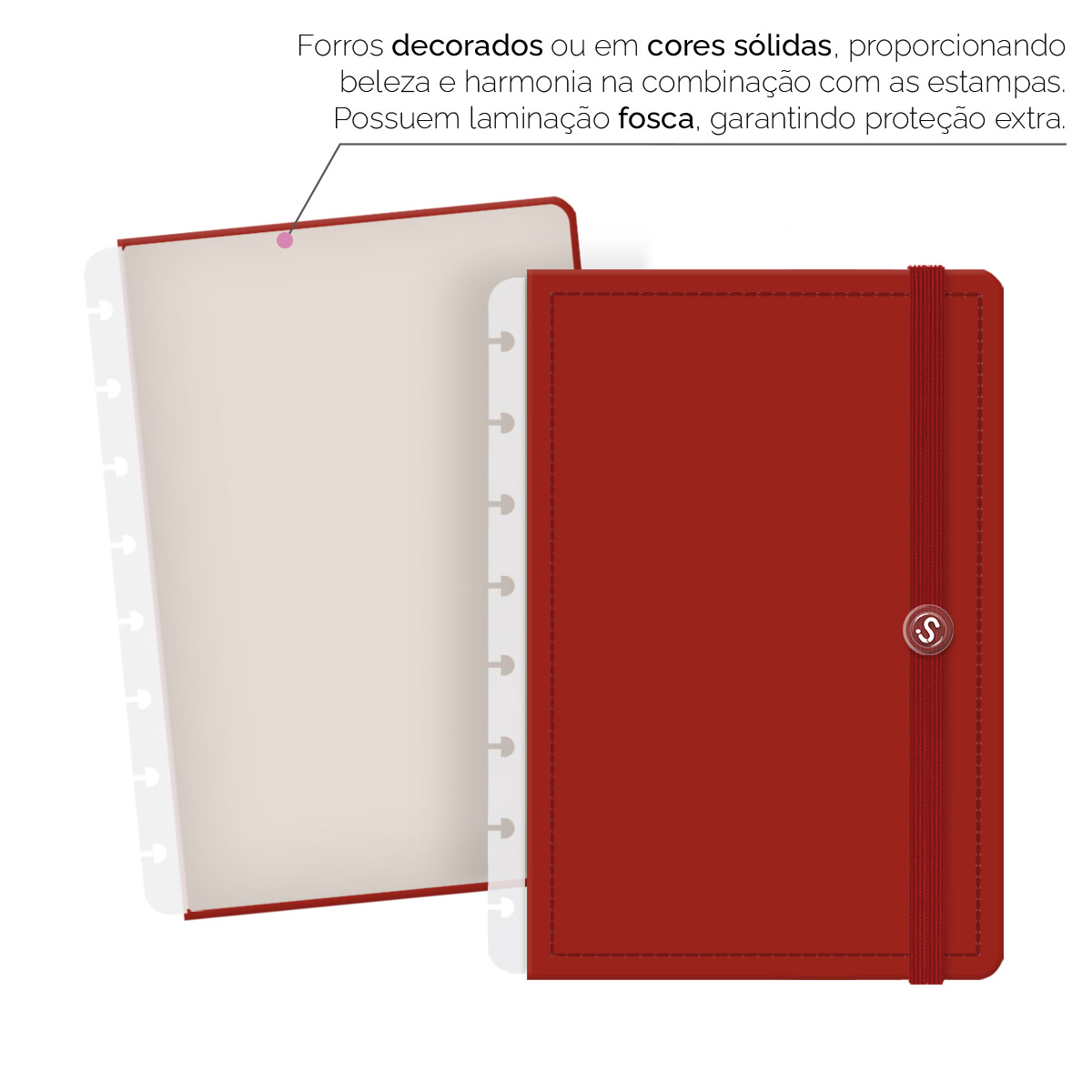- Forros decorados ou em cores sólidas, com laminação fosca, garantem proteção extra.