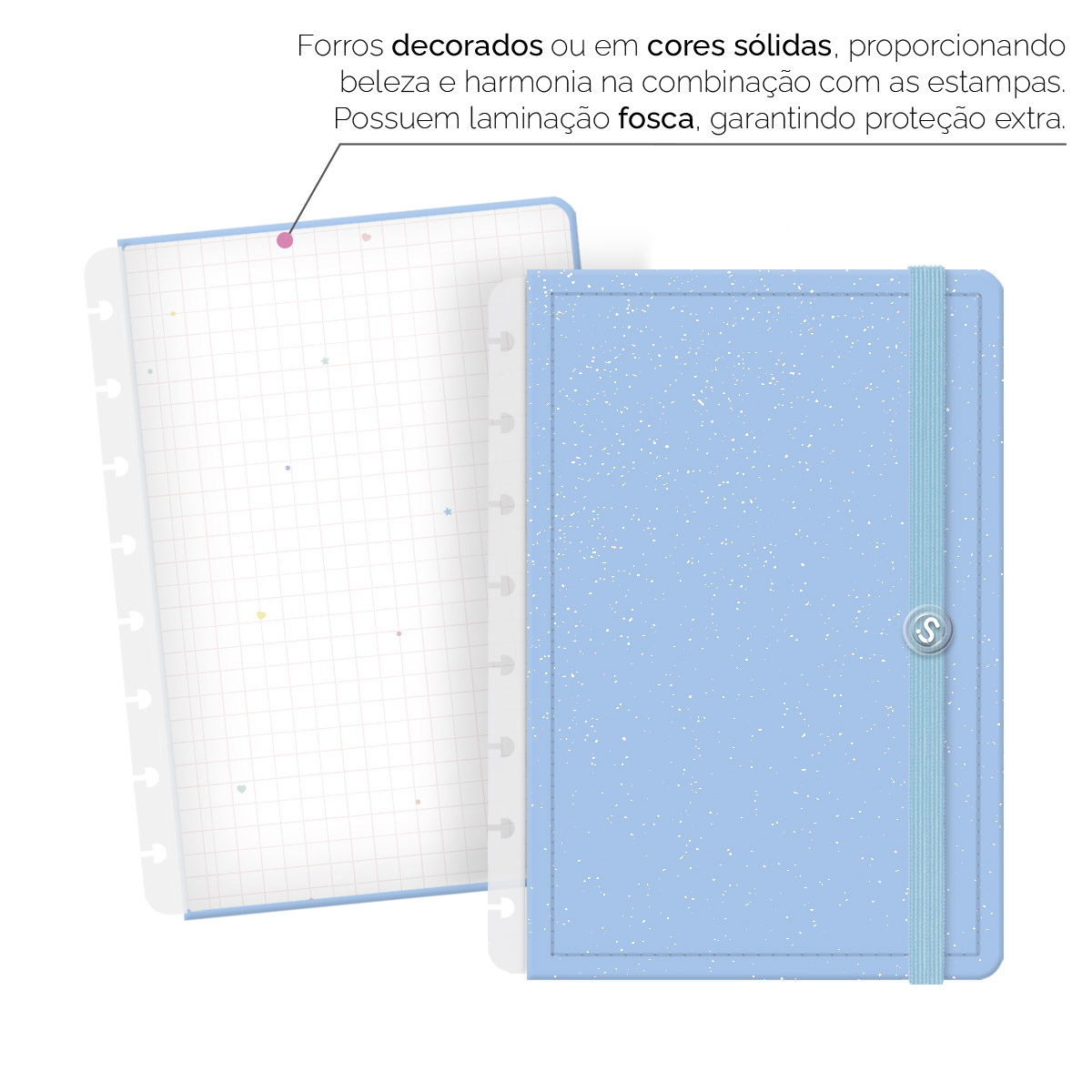 Com as capas iscool Prime, você pode renovar a “cara” do seu caderno de disco sempre que desejar! A caixa inclui capa e contracapa, além de extras que fazem toda a diferença: elástico para fechamento da capa, folha de dados e calendário.