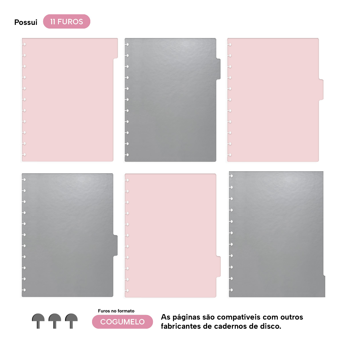 São 6 divisórias laminadas (frente e verso), tamanho “G” (21 x 27,5 cm), em papel 250 g.