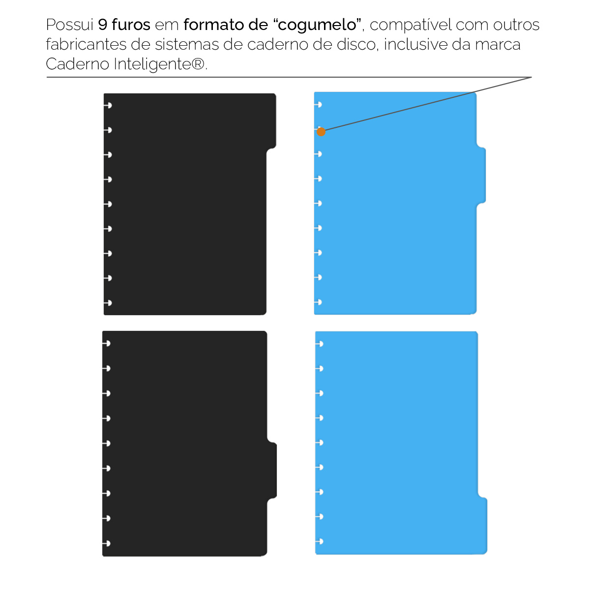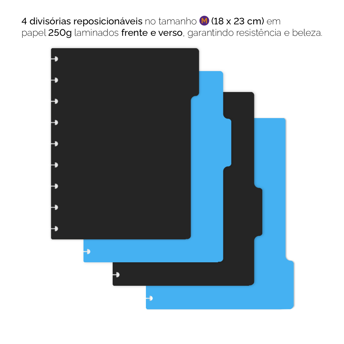 A embalagem contém 6 divisórias no tamanho “G” (21 x 27,5 cm) que podem ser colocadas em qualquer local do caderno. Elas são impressas com tecnologia digital de alta qualidade em papel couché 250 g, com laminação frente e verso, o que as torna mais protegidas e resistentes.